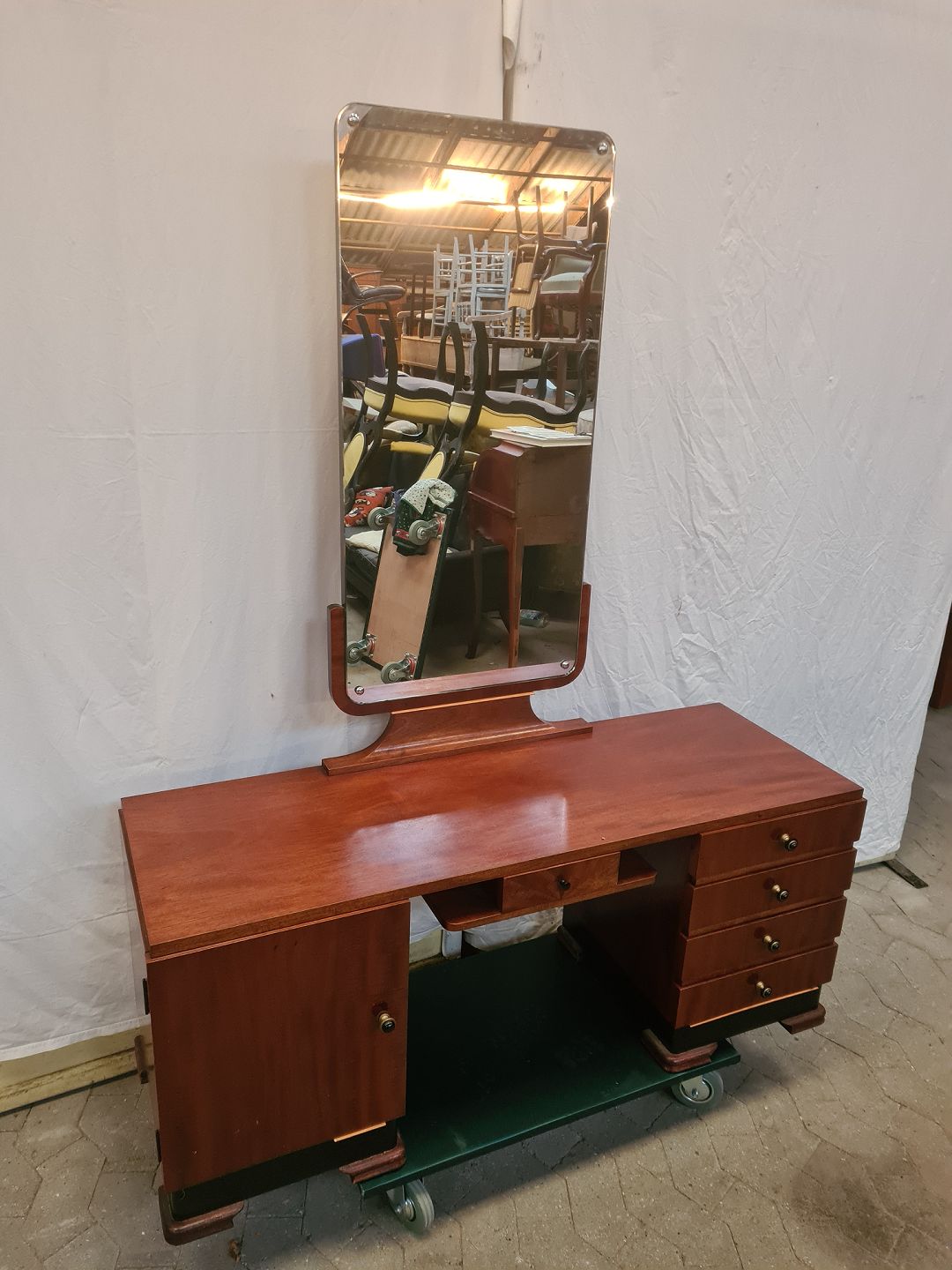 Sminkebord i fineret mahogni, fra 1930erne. Det har brugsspor og en løs liste. Højde 158cm Bredde 128cm Dybde 42cm Bordplade højde 52cm Emne nummer: 90936