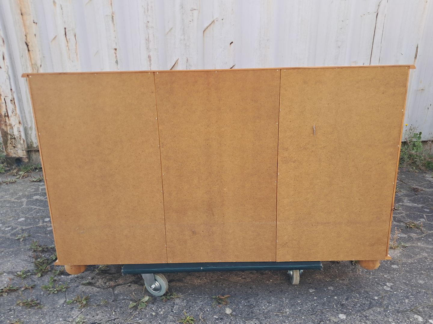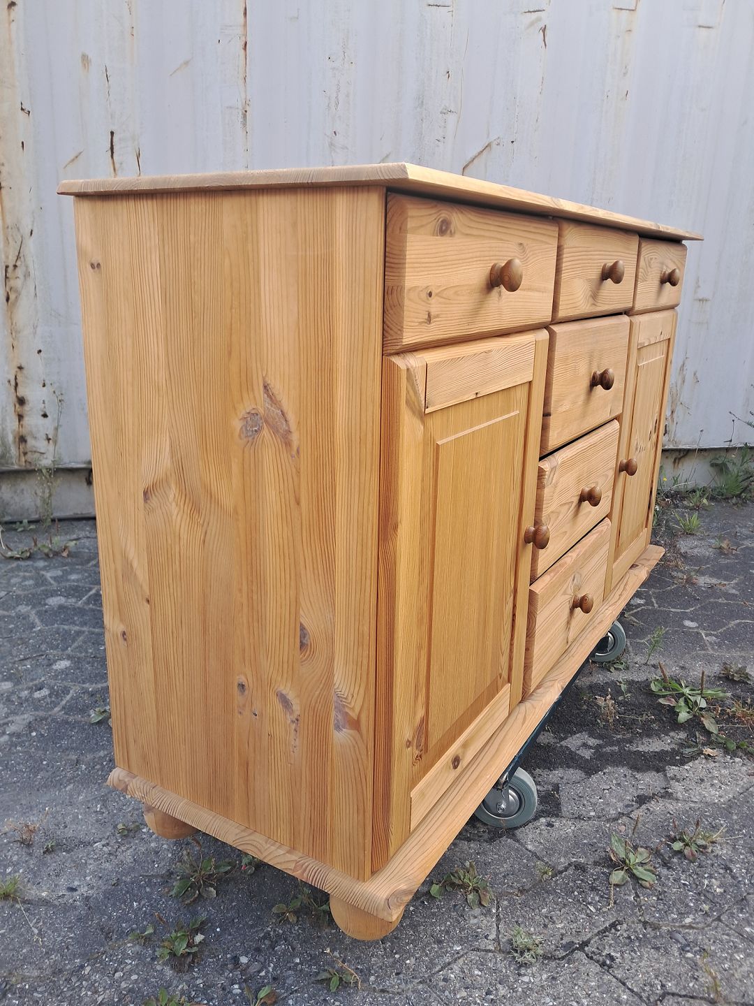 Skænk i massivt fyrretræ, fra 1990erne. Den har brugsspor. Højde 78cm Bredde 130cm Dybde 42cm Emne nummer: 77043