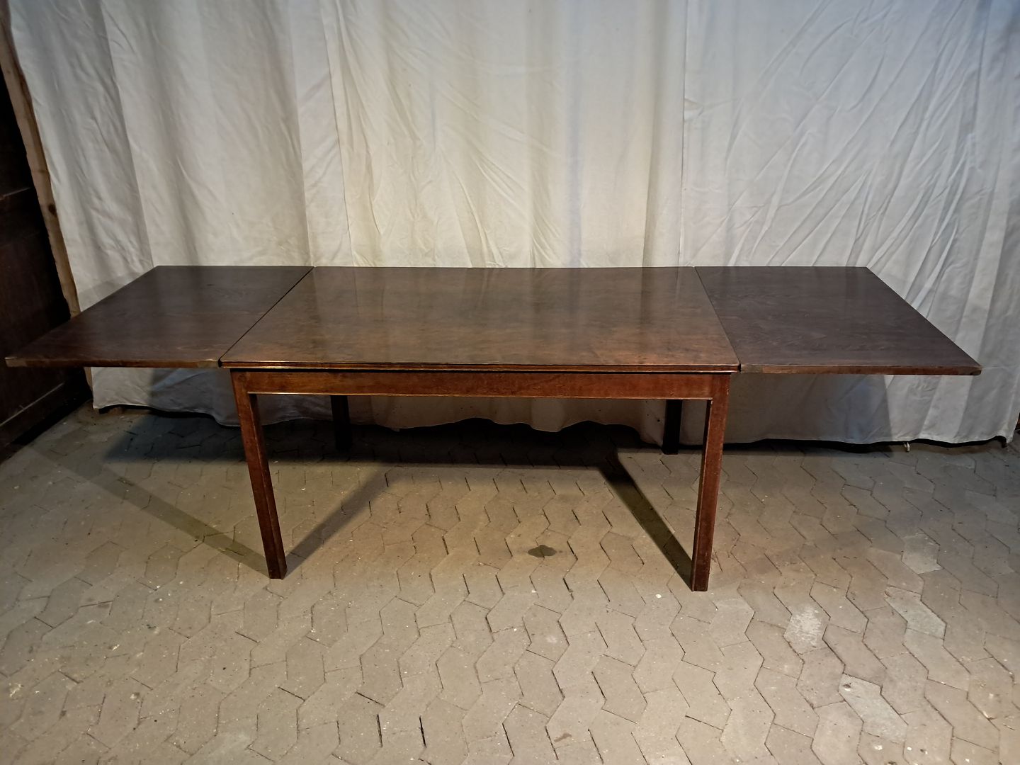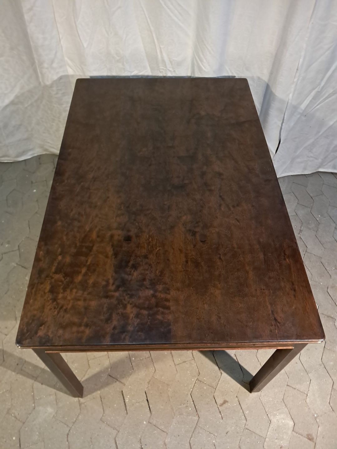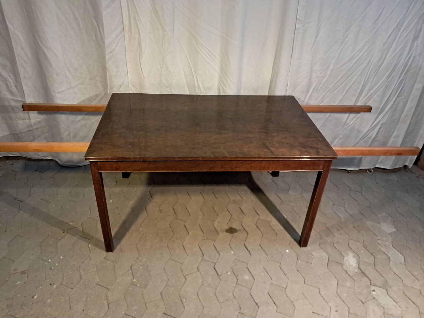 Spisebord i fineret birketræ med 2 tillægsplader, fra 1930erne. Det har brugsspor. Højde 75cm Bredde 90cm Længde 140cm Længde med tillægsplader 260cm Emne nummer: 91896