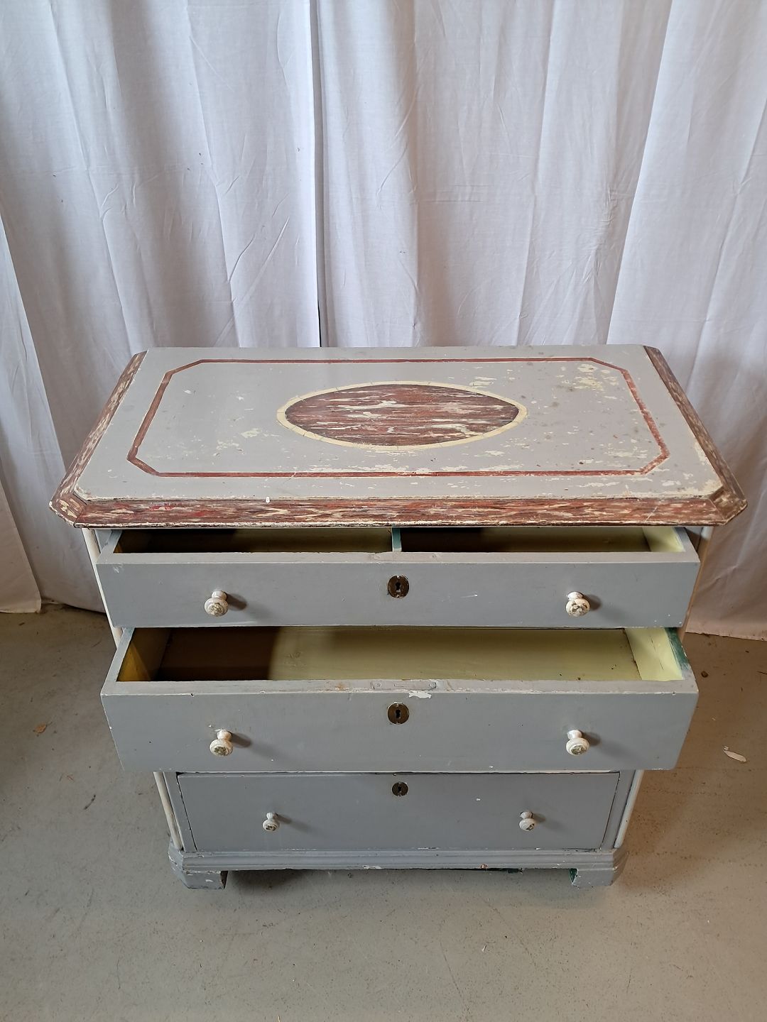 Malet kommode fra 1910erne. Den har brugsspor og der medfølger ikke nøgle. Højde 95cm Bredde 95cm Dybde 50cm Emne nummer: 77186
