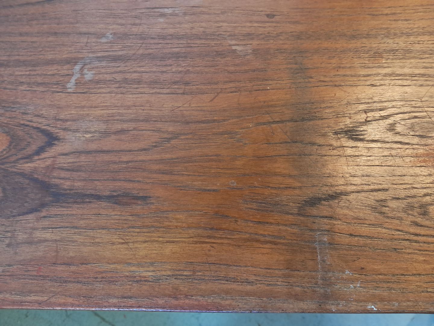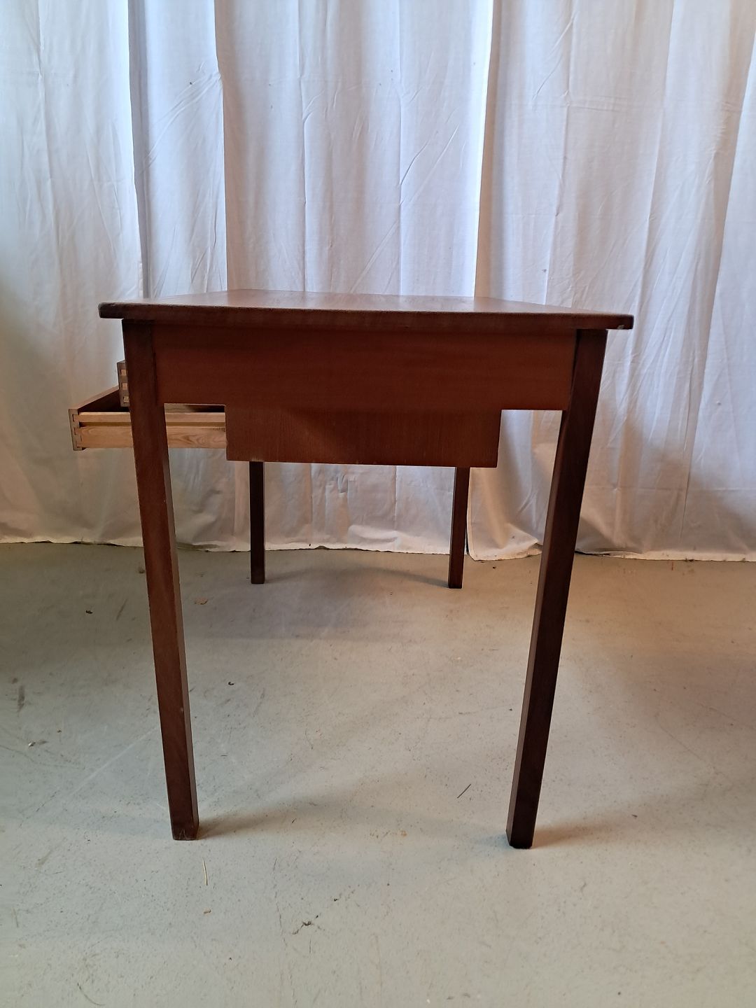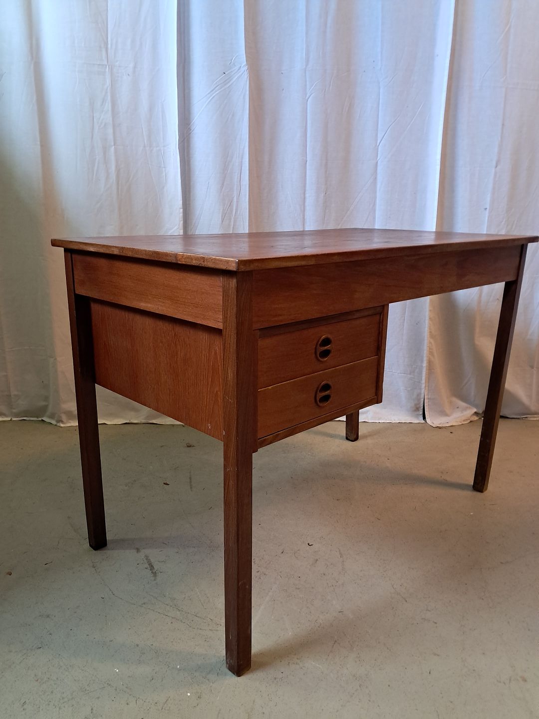 Skrivebord i fineret teaktræ, fra 1960erne. Det har brugsspor. Højde 72cm Bredde 105cm Dybde 60cm Emne nummer: 77208