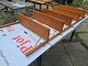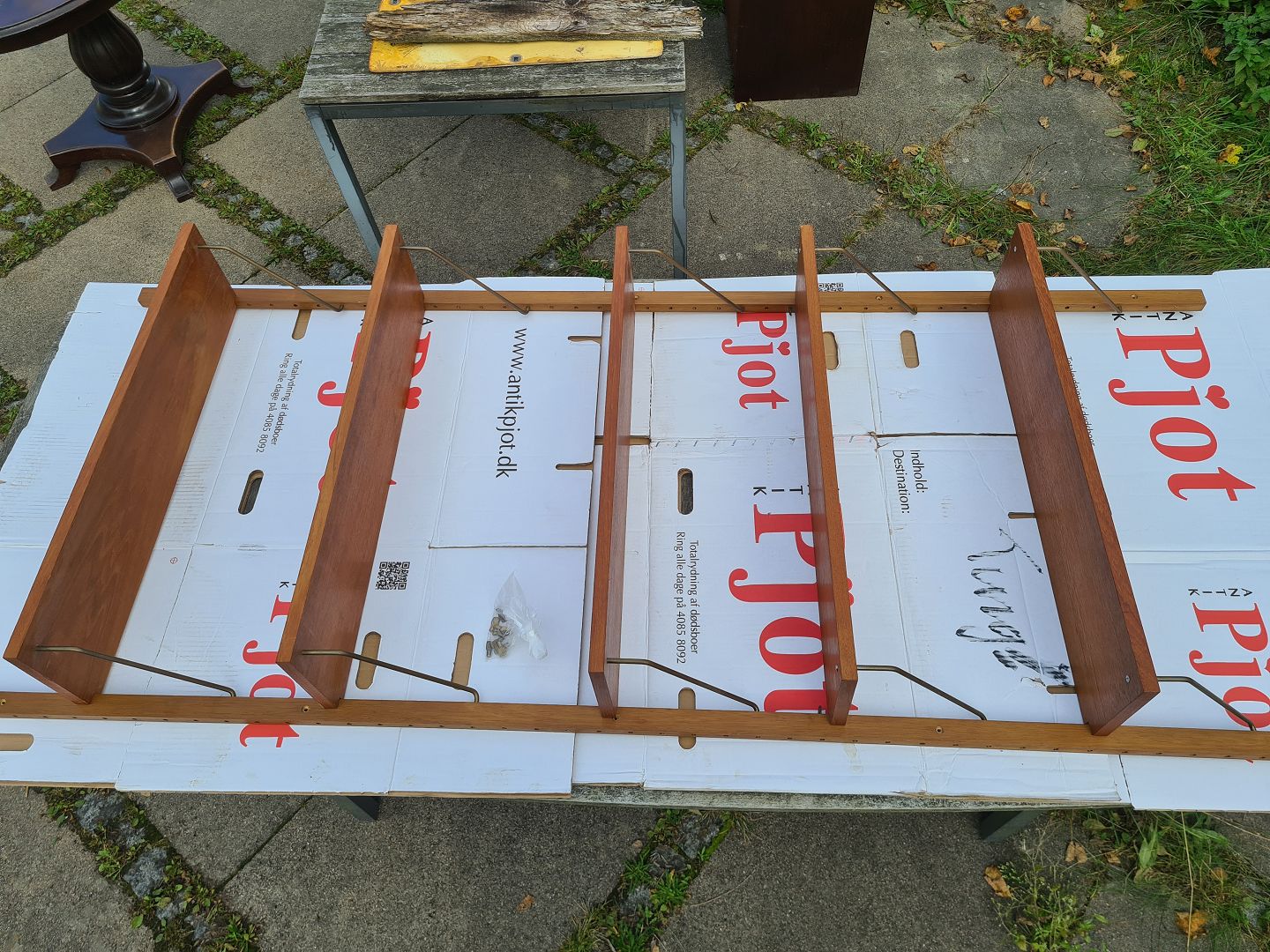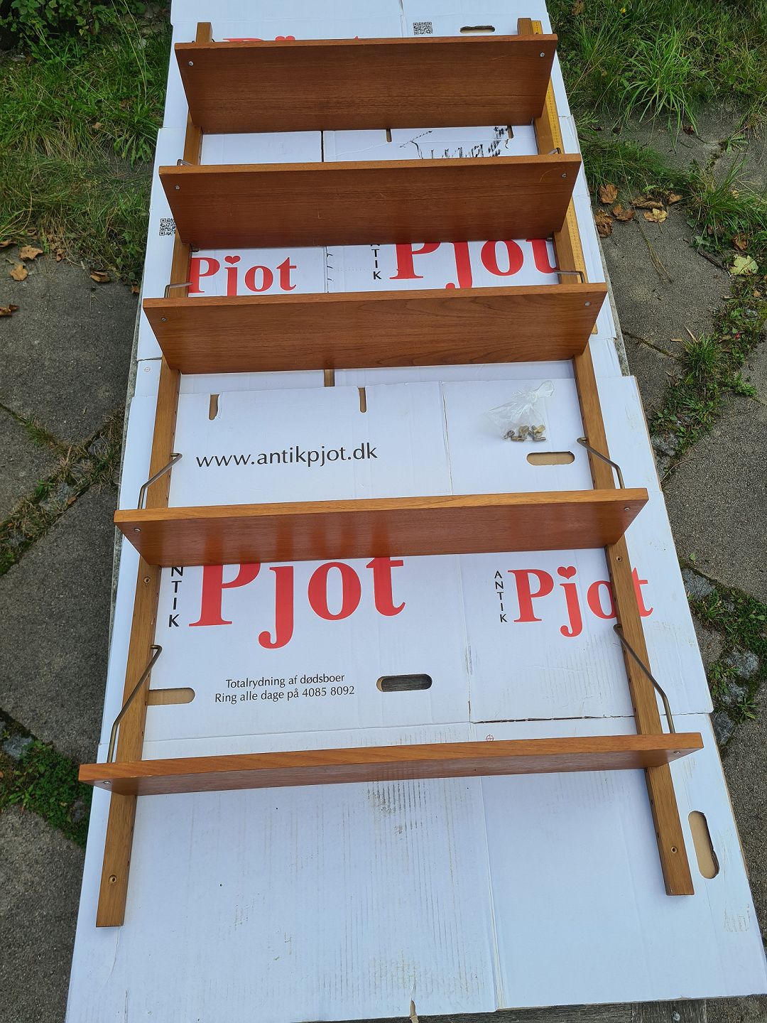 Reol til ophængning på væggen fra 1960'erne i finéret teak. Består 5 hylder á 80 x 20 cm. og 2 vanger á 198 cm. Pænt og ok velholdt dog med lidt brugsspor i form af overflade skrammer og uoriginale skruer. (Billede) Emne nummer: 80903