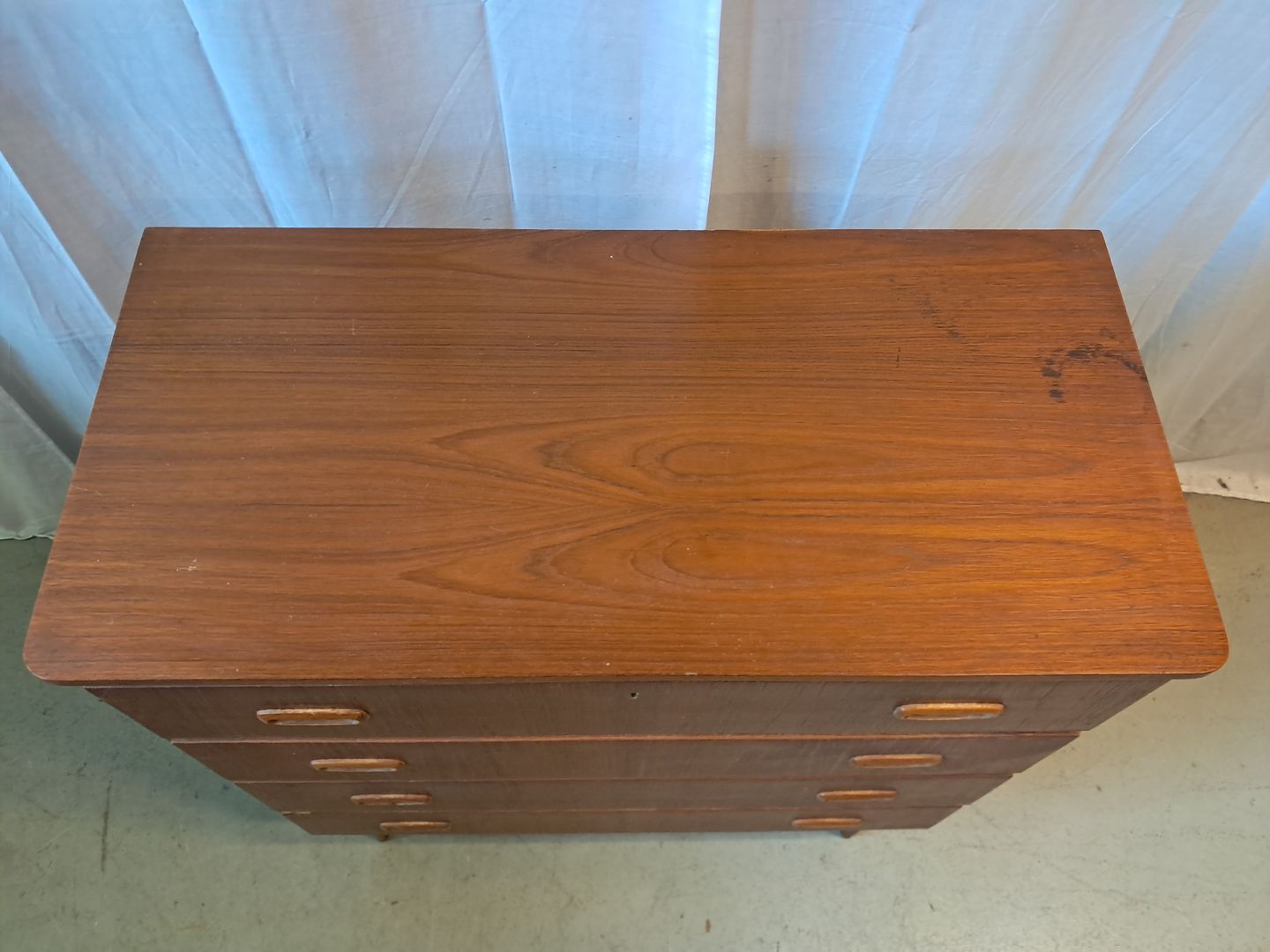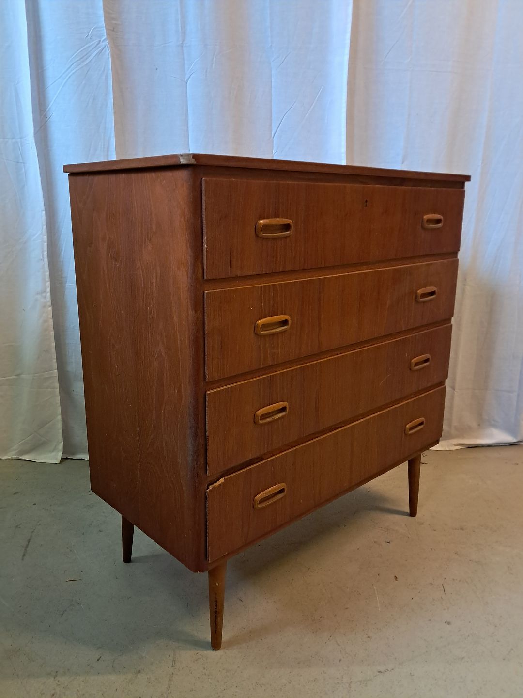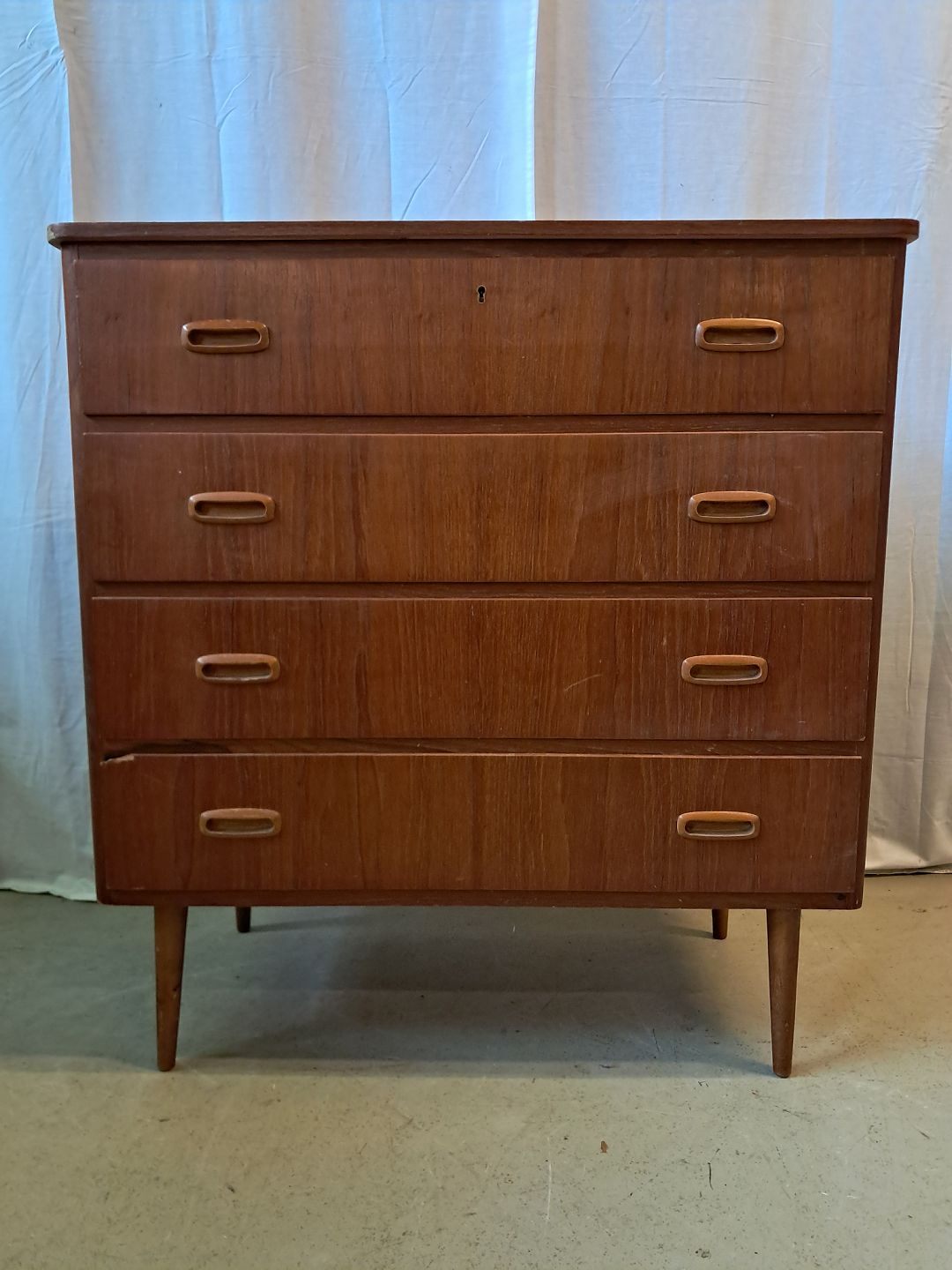 Kommode i fineret teaktræ, fra 1960erne. Den har brugsspor og en defekt.(se foto) Højde 87cm Bredde 80cm Dybde 40cm Emne nummer: 77287