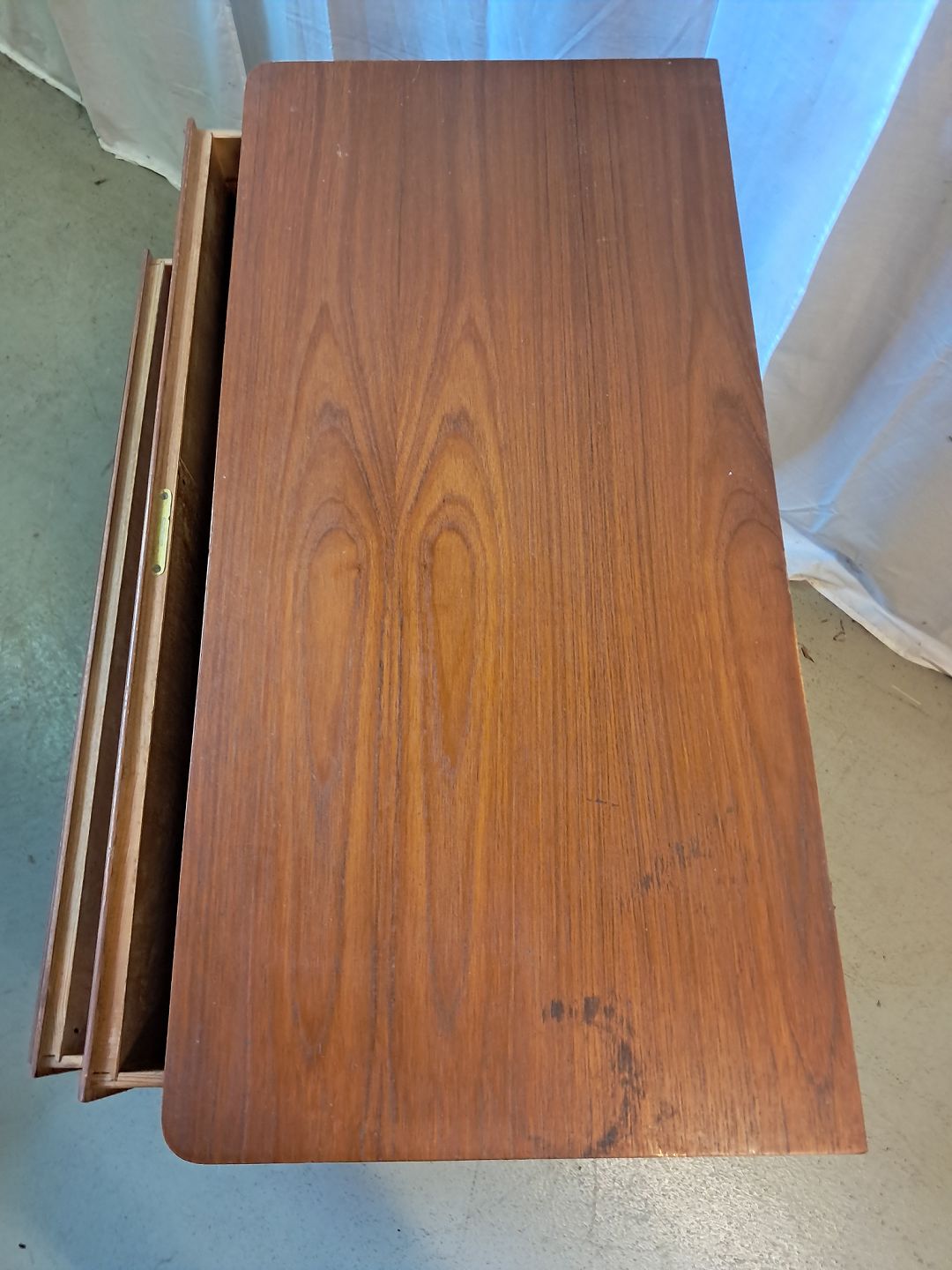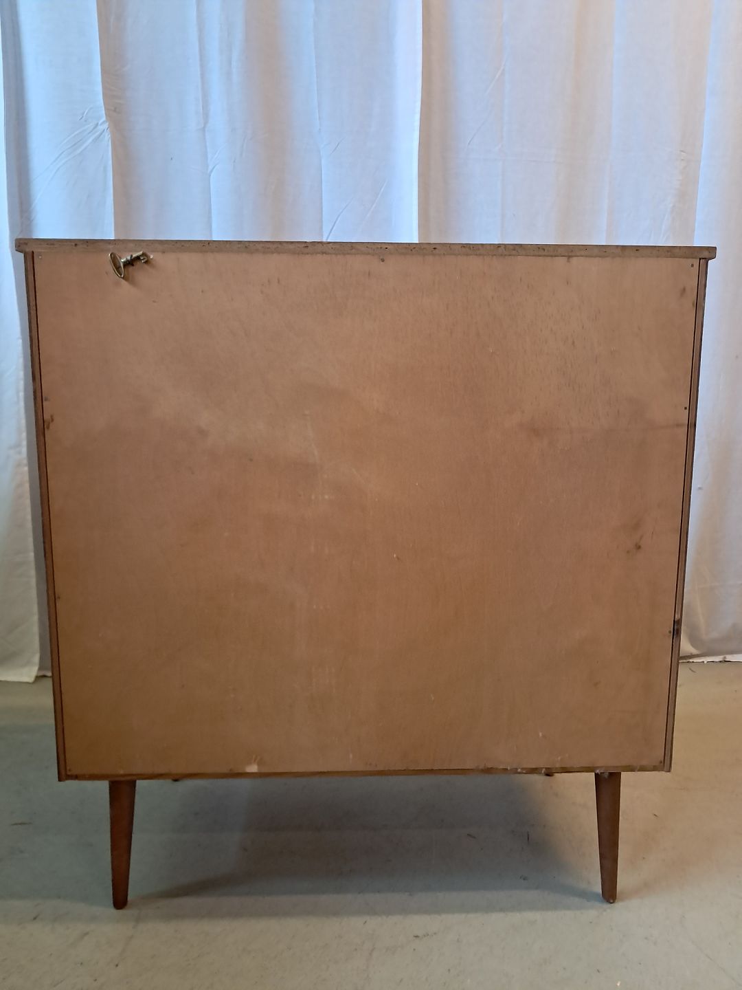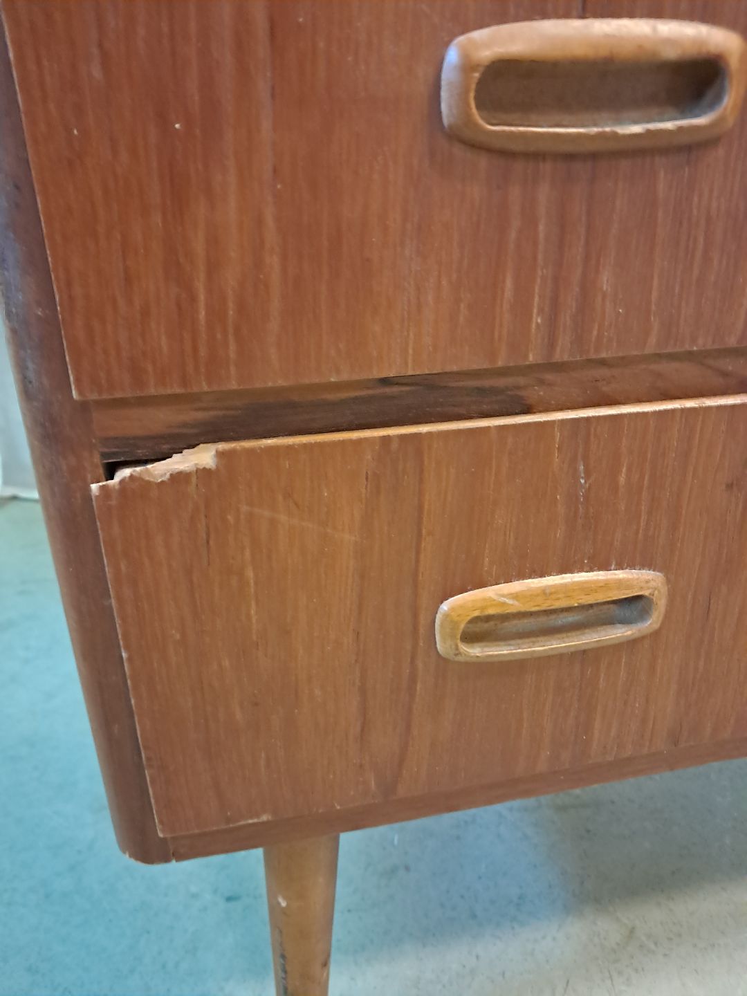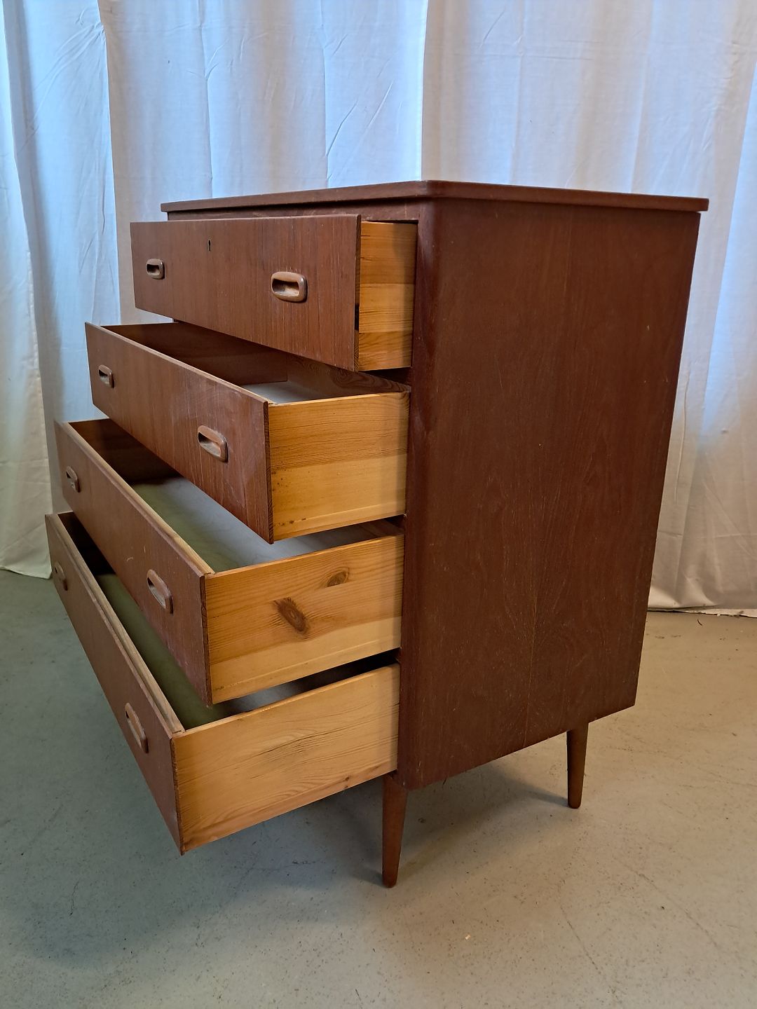 Kommode i fineret teaktræ, fra 1960erne. Den har brugsspor og en defekt.(se foto) Højde 87cm Bredde 80cm Dybde 40cm Emne nummer: 77287