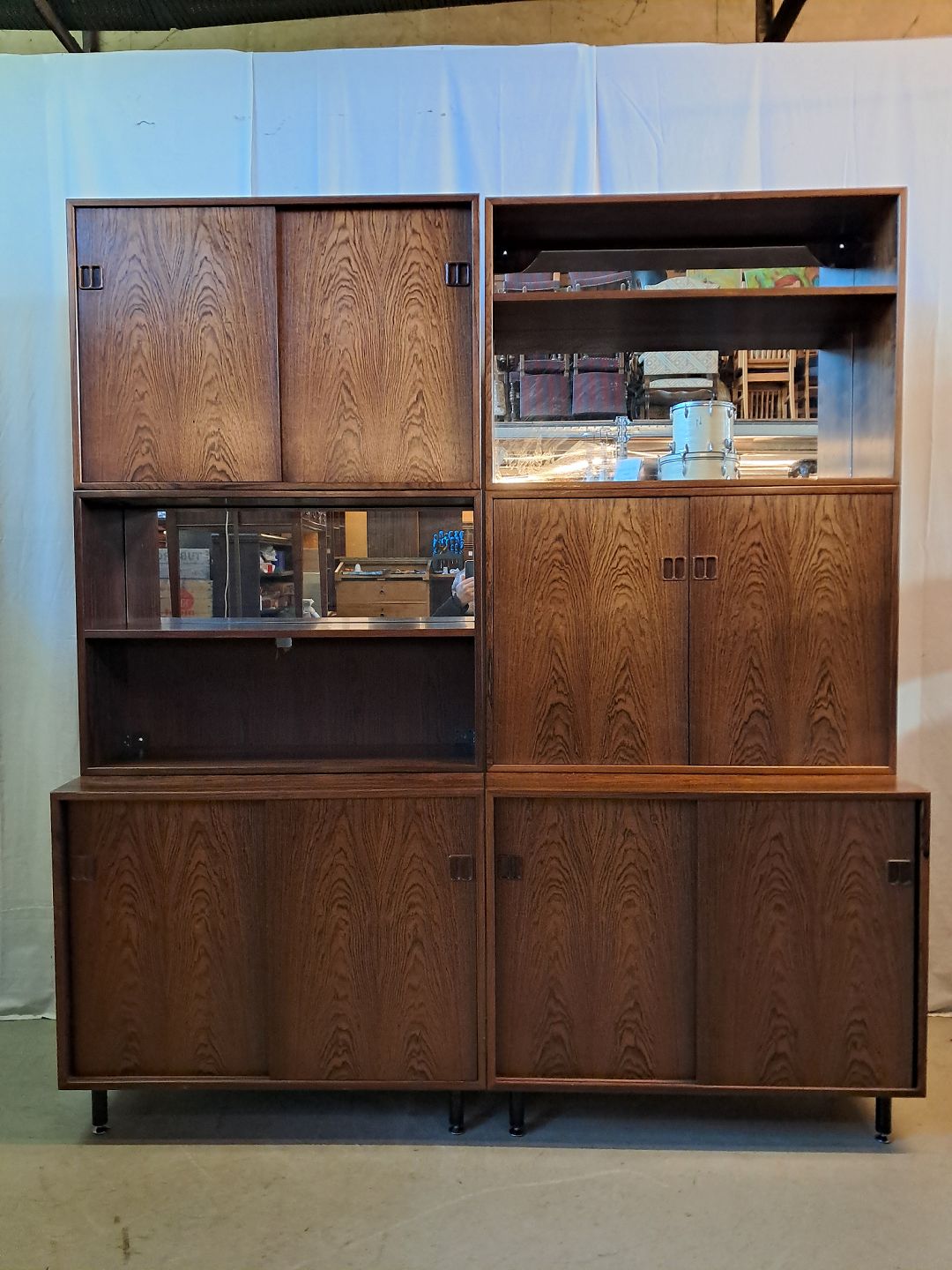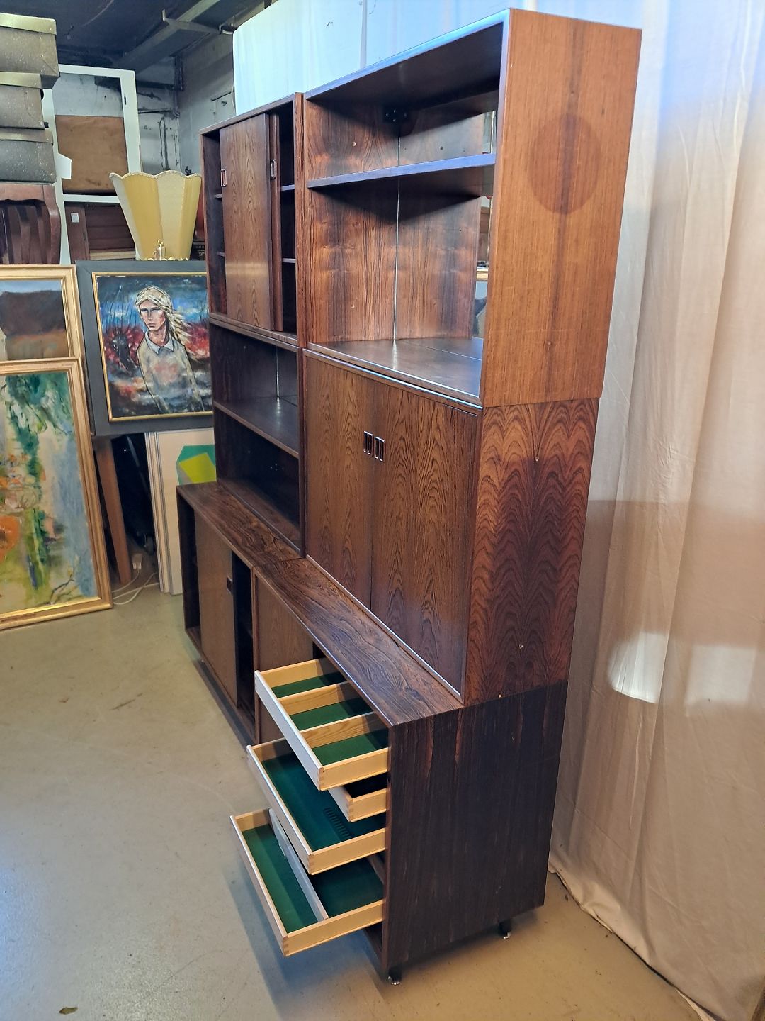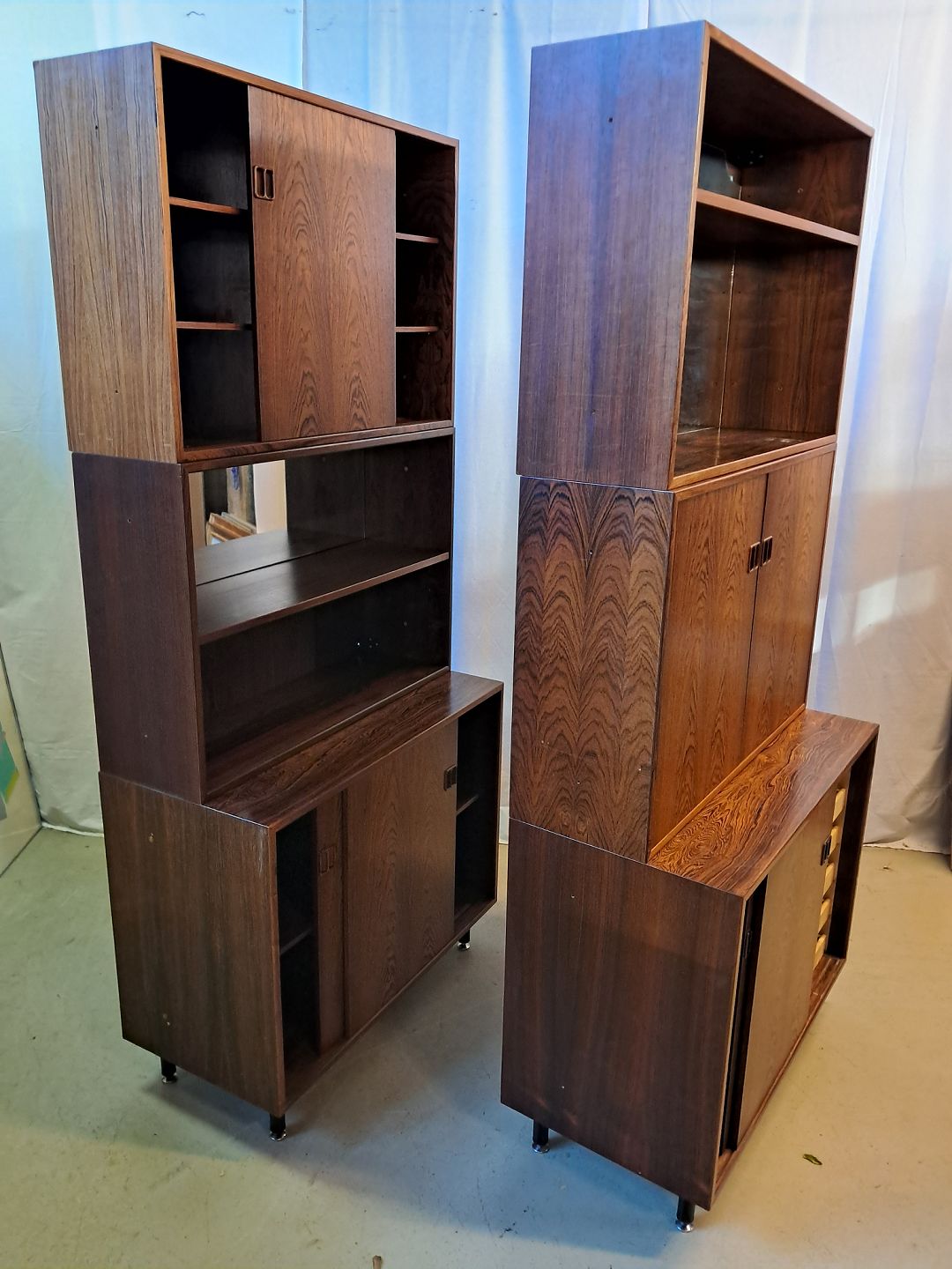 2 Reolsektioner i fineret palisander, fra 1960erne. De har brugsspor. Højde 192cm Bredde 86cm Dybde 42cm og 28cm Emne nummer: 77307