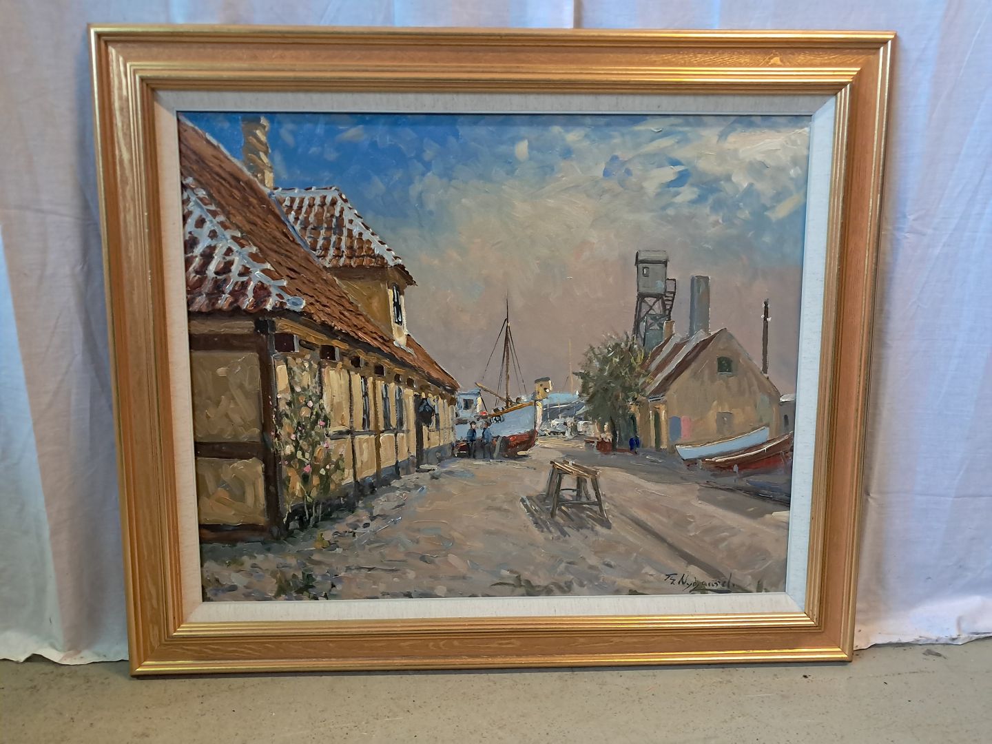 Maleri af Dragør Havn i guldmalet ramme, af : Th. Nygaard Det har brugsspor. Højde 80cm Bredde 94cm Emne nummer: 77333