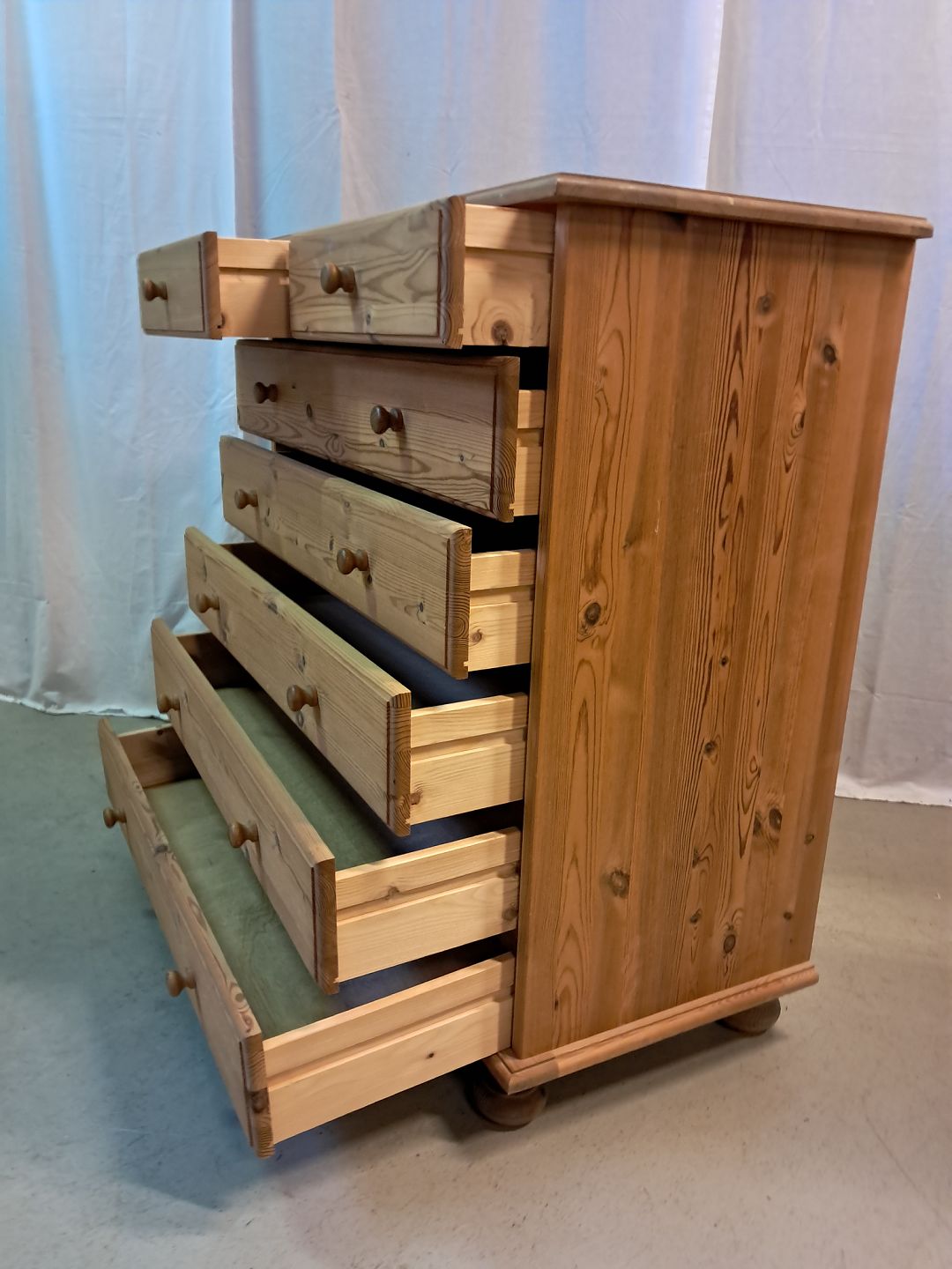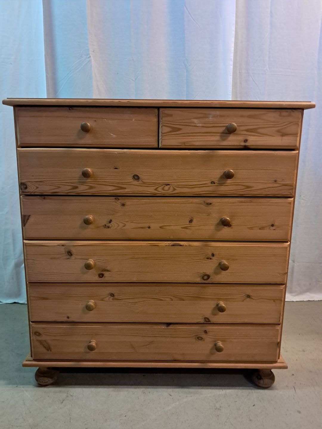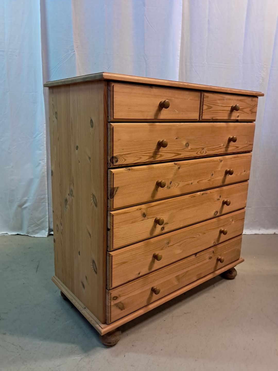 Kommode i massivt fyrretræ, fra 1990erne. Den har brugsspor. Højde 98cm Bredde 92cm Dybde 43cm Emne nummer: 77374