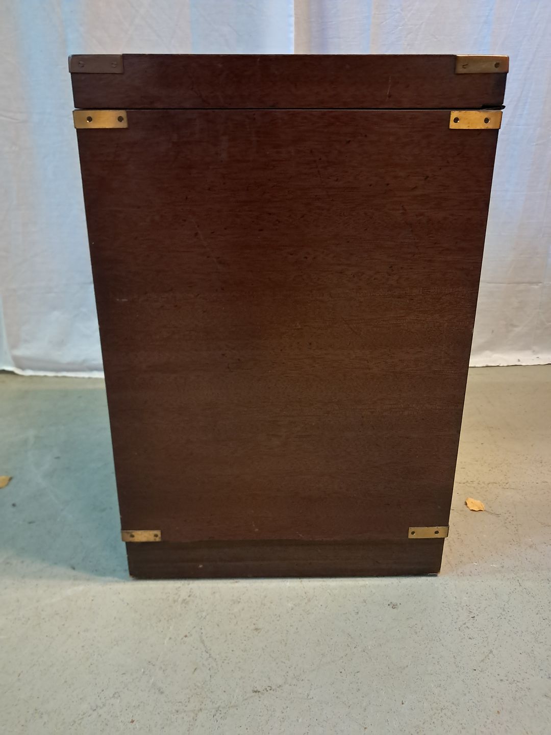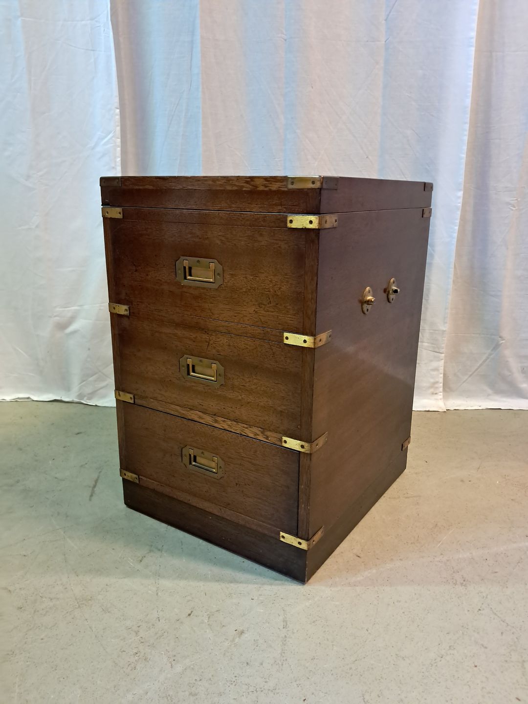 Military skab i fineret mahogni, fra 1980erne. Det har brugsspor og det ene håndtag er defekt. Højde 61cm Bredde 41cm Dybde 46cm Emne nummer: 77380