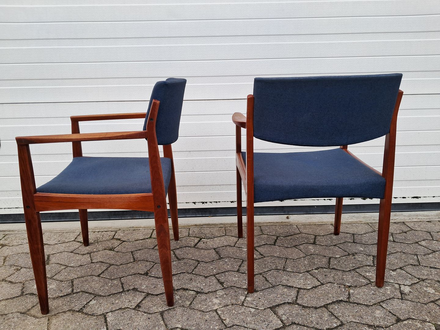 2 Armstole i massivt teaktræ, fra 1960erne. De har brugsspor og defekt betræk. Ryghøjde 78cm Sædehøjde 44cm Emne nummer: 77387