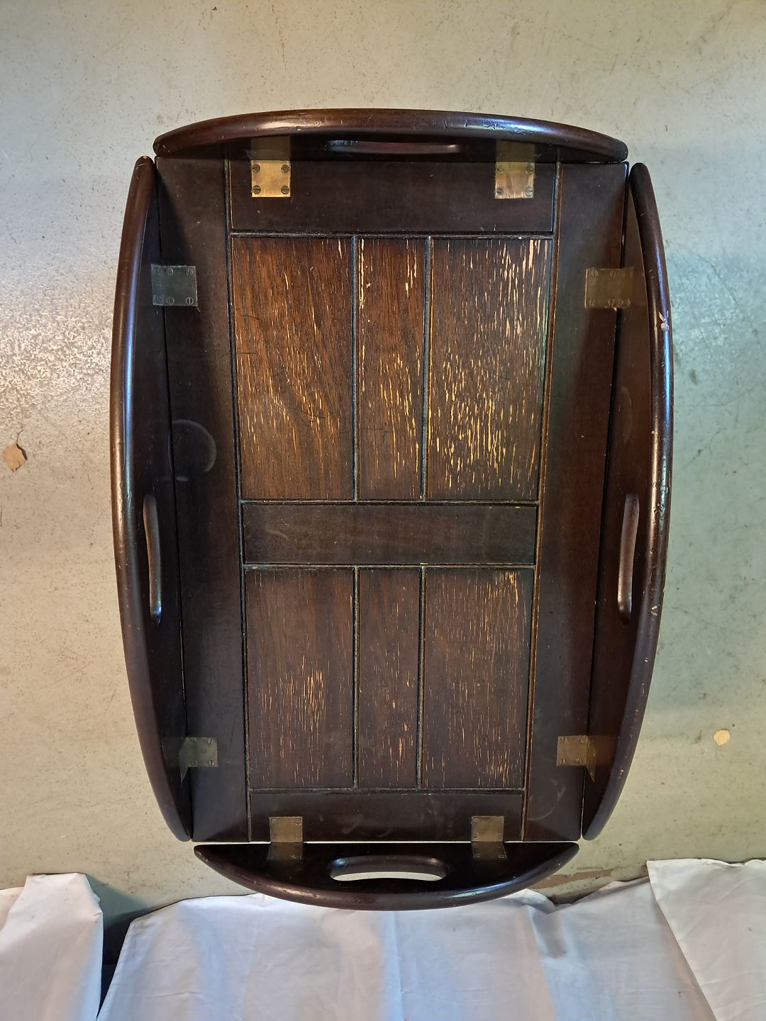 Butlers tray i fineret bøgetræ, fra 1980erne. Det har brugsspor. Højde 48cm Bredde 64cm Længde 84cm Emne nummer: 77401