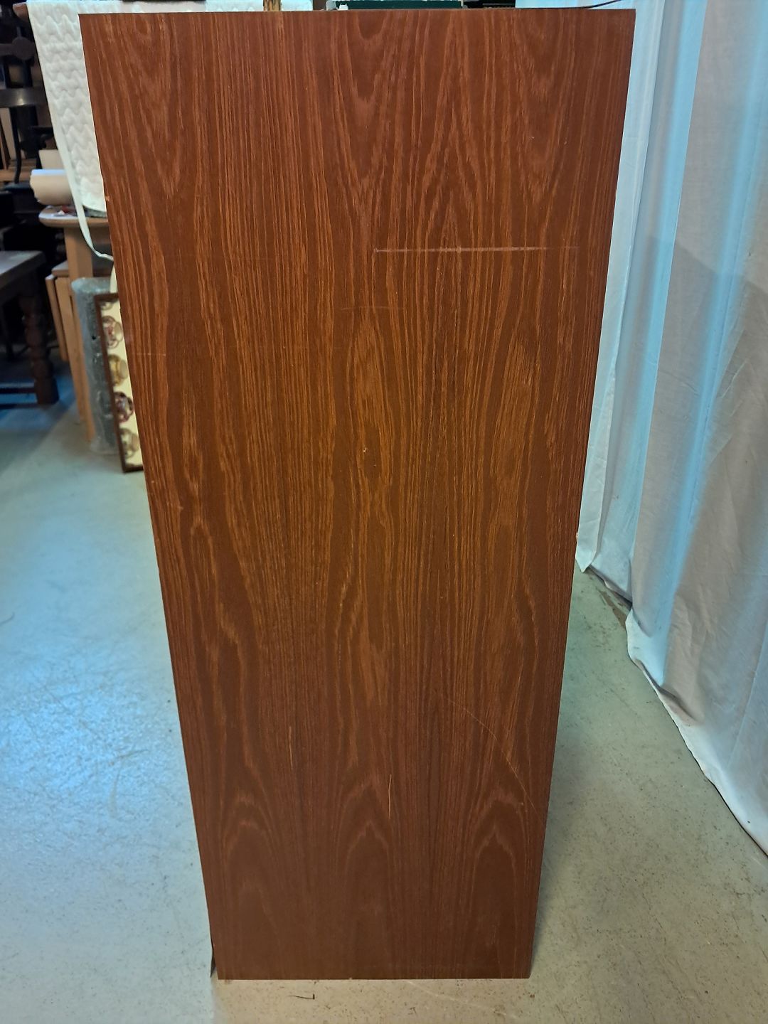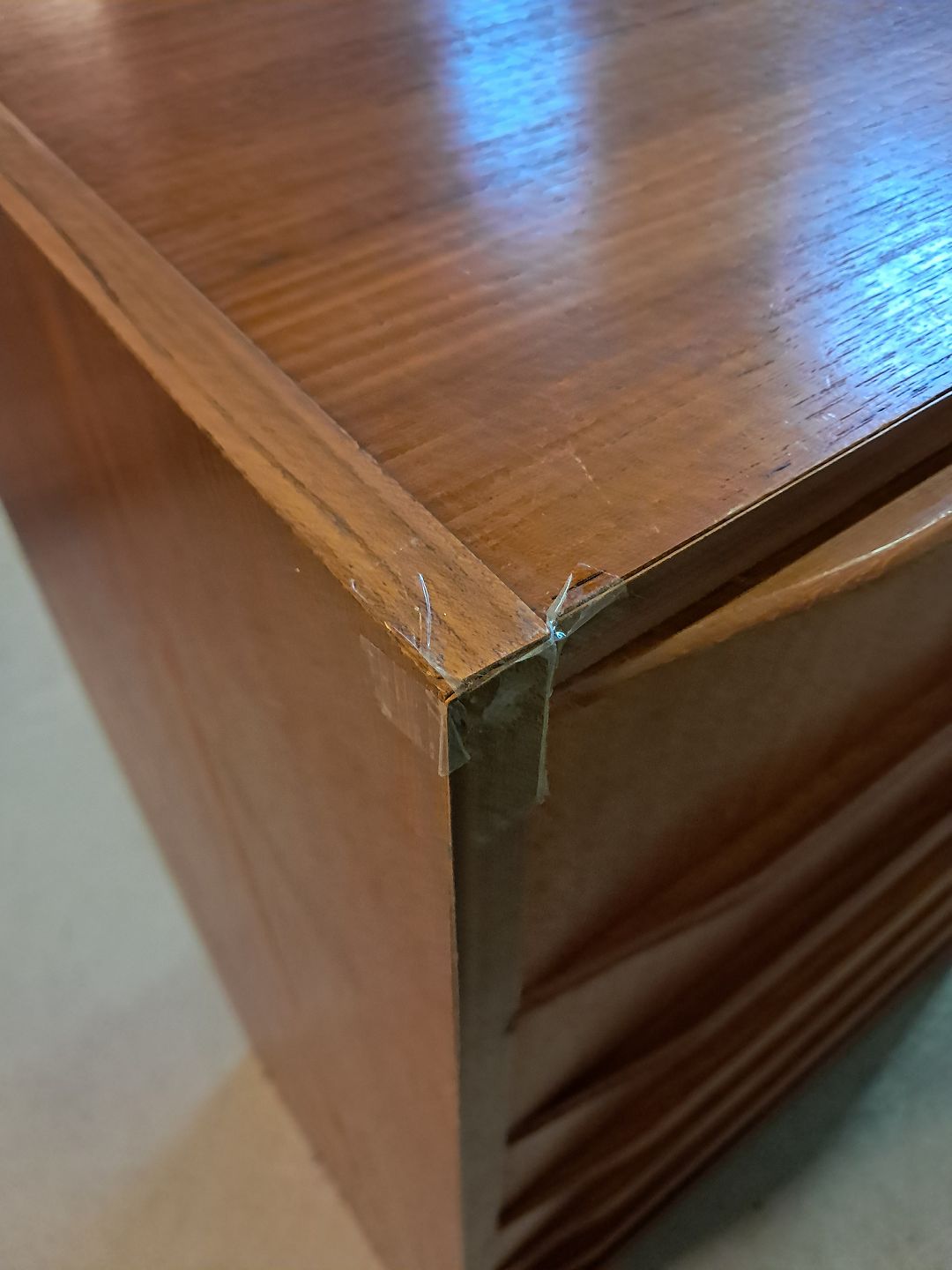 Kommode i fineret teaktræ, fra 1960erne. Den har brugsspor og defekte plast kantlister/bånd. Højde 110cm Bredde 76cm Dybde 41cm Emne nummer: 77407