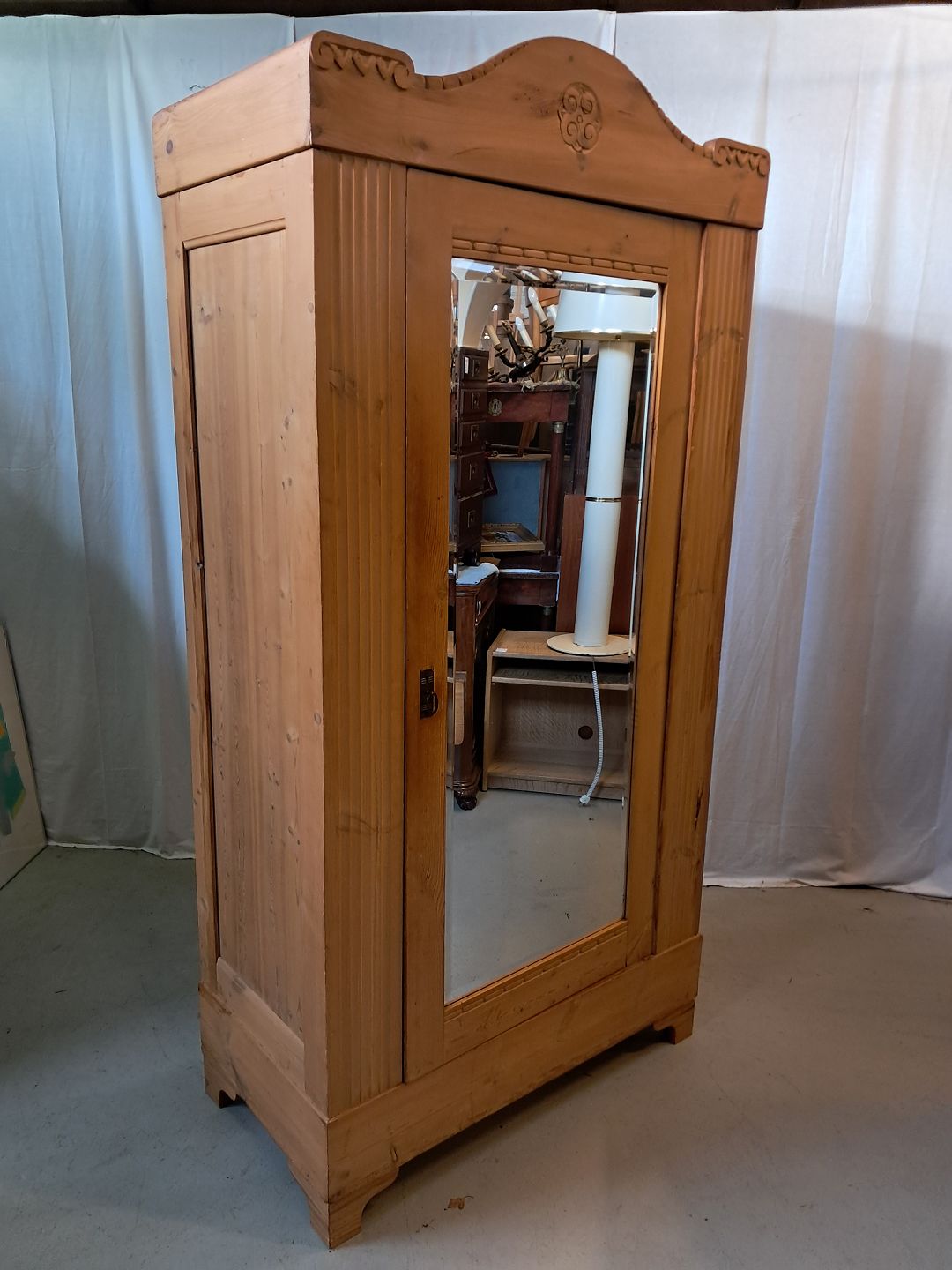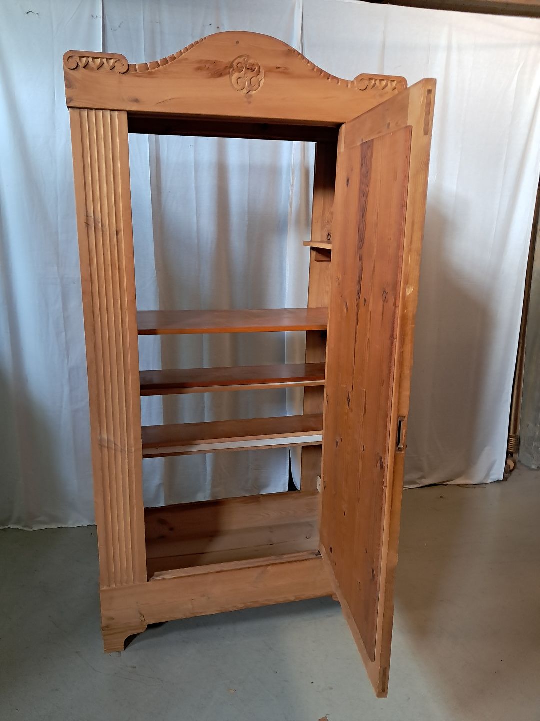 Skab i massivt fyrretræ, fra 1920erne. Det har brugsspor og mangler bagbeklædning, det lugter af tobak og skal vaskes ned. Højde 202cm Bredde 100cm Dybde 54cm Emne nummer: 77424