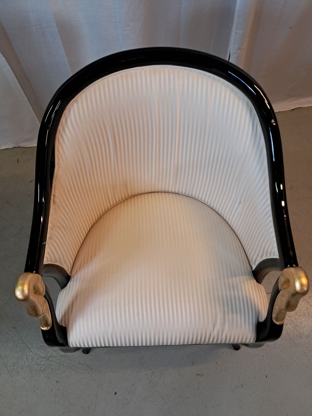 Lysberg Hansen og Terp armstol i malet træ, fra 1990erne. Den har brugsspor og defekt betræk. (se foto) Ryghøjde 83cm Sædehøjde 46cm Emne nummer: 77427
