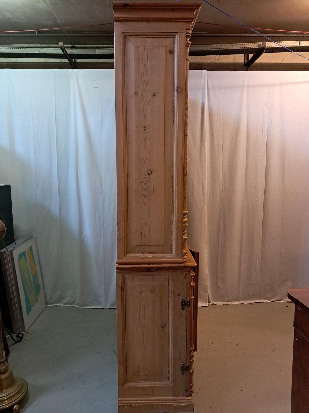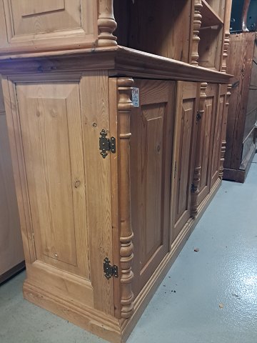Skab med reol overdel i massivt fyrretræ, fra 1980erne. Det har brugsspor og lågerne gaber en lille smule. Højde 212cm Bredde 167cm Dybde 42cm Emne nummer: 77431