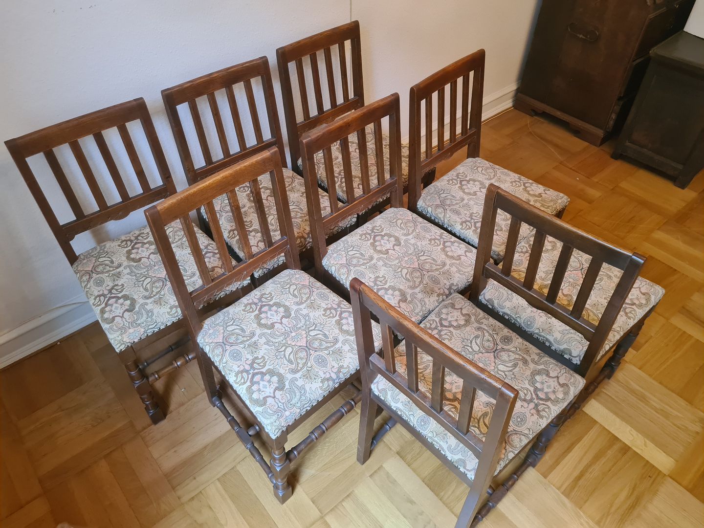 8 Spisebordsstole fra starten af 1900 tallet i eg og med stofbetrukket sæde. Fremstår pæne og stabile uden nævneværdige brugsspor. Passer evt. til armstole nr. 93004 Højde 88 cm. Bredde 44 cm. Dybde 46 cm. Sædehøjde 46 cm. Emne nummer: 93005