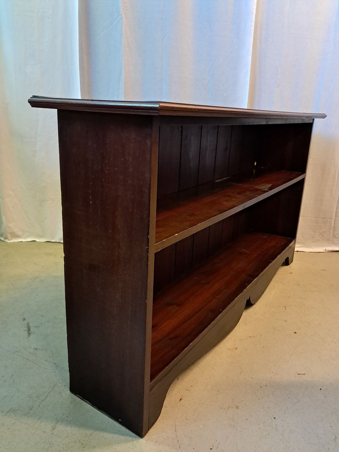 Reol i fineret mahogni, fra 1910erne. Den har brugsspor. Højde 80cm Bredde 148cm Dybde 35cm Emne nummer: 77450