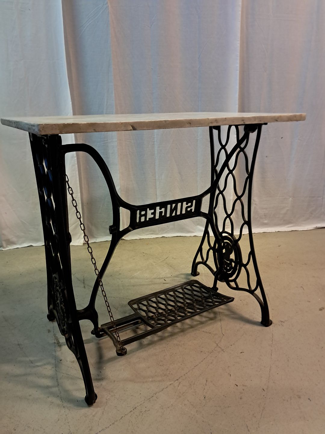 Singer symaskine-understel i metal med marmorplade, fra 1920erne. Det har brugsspor. Højde 74cm Bredde 75cm Dybde 52cm Emne nummer: 77456