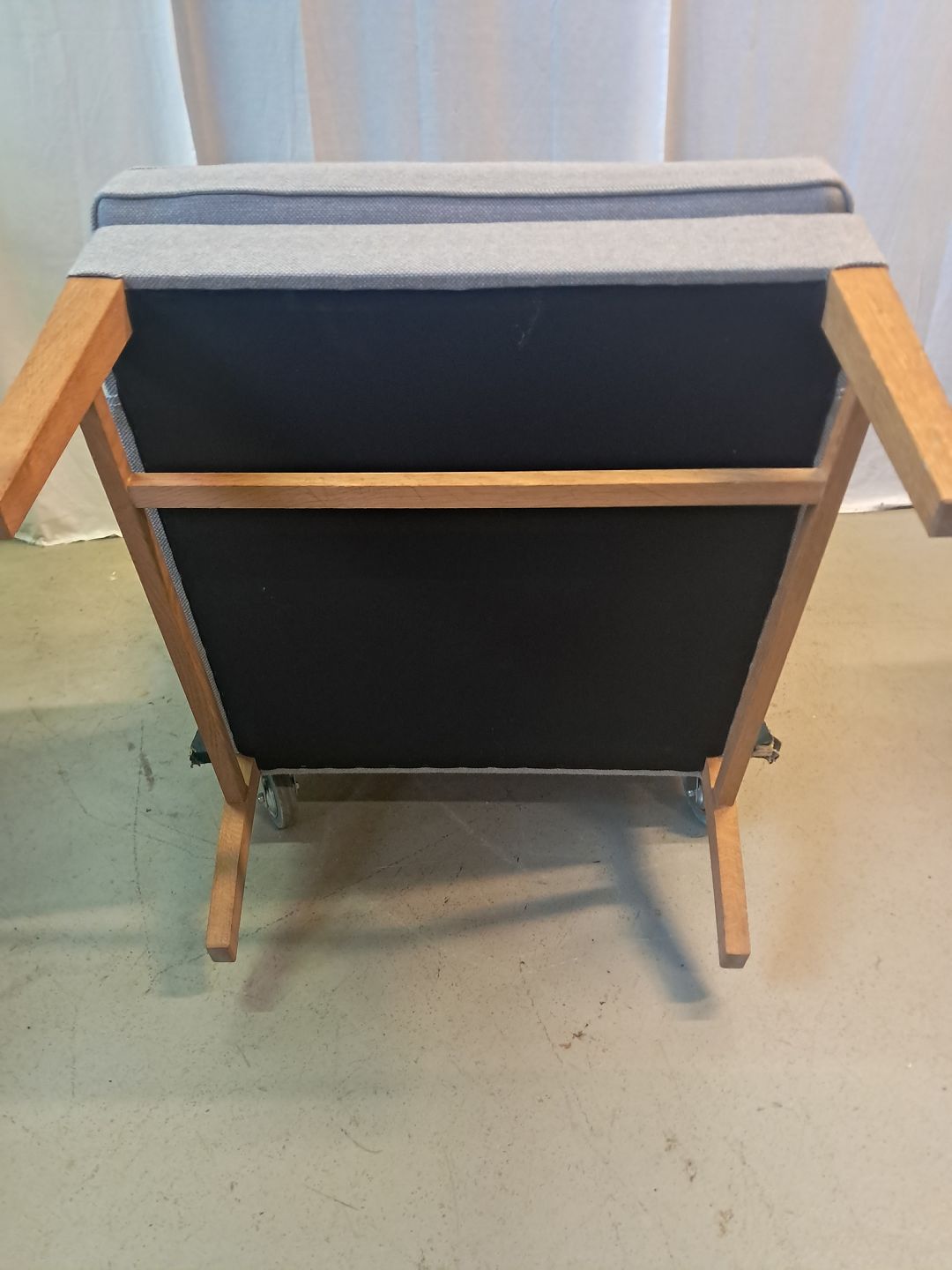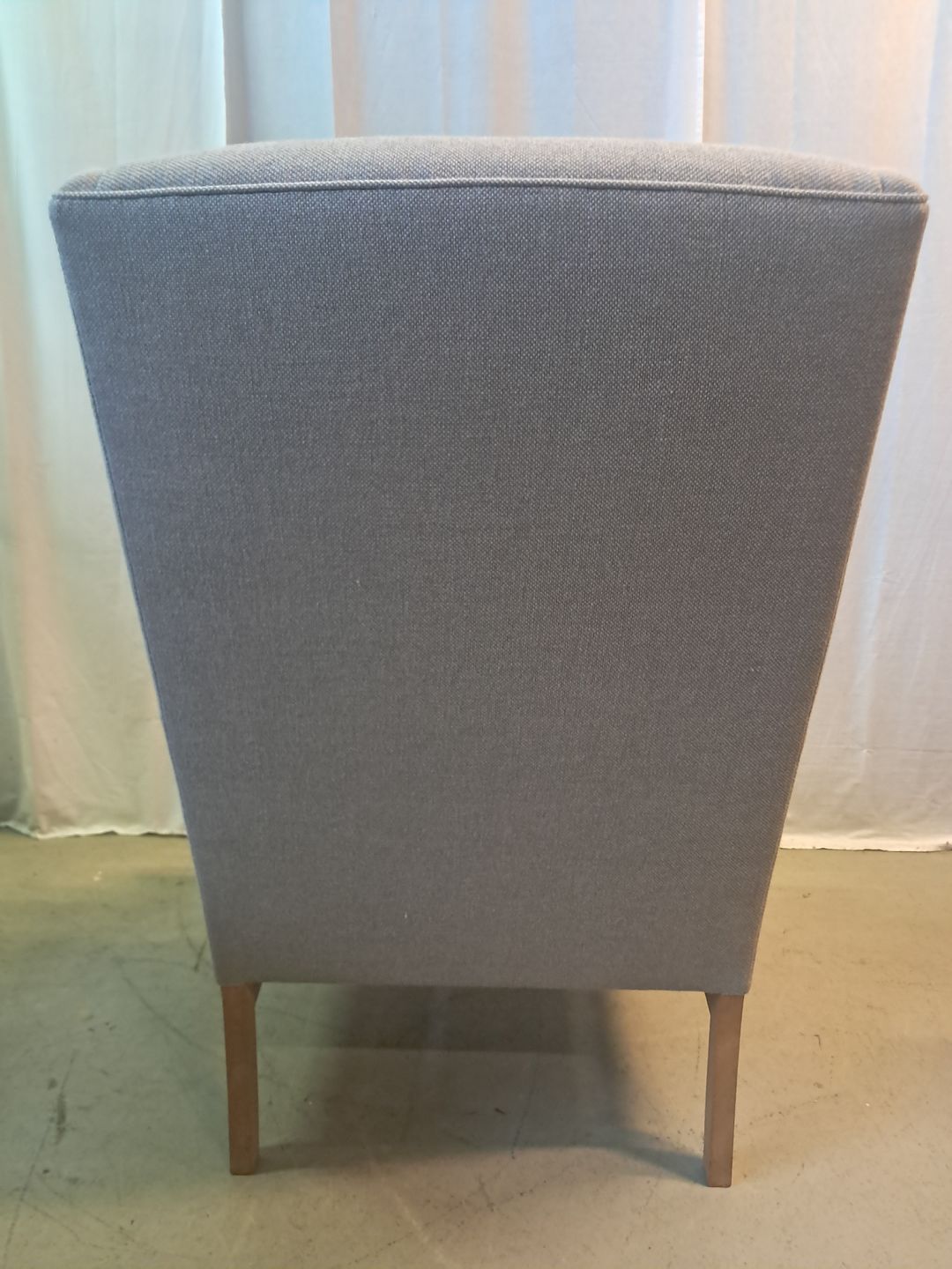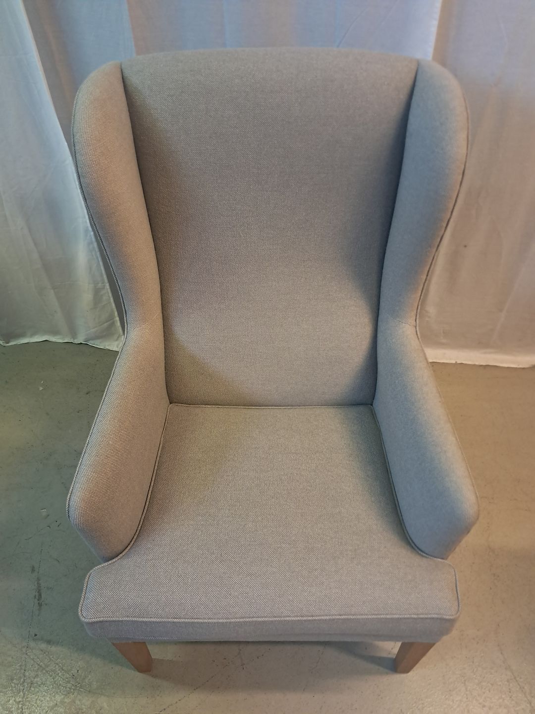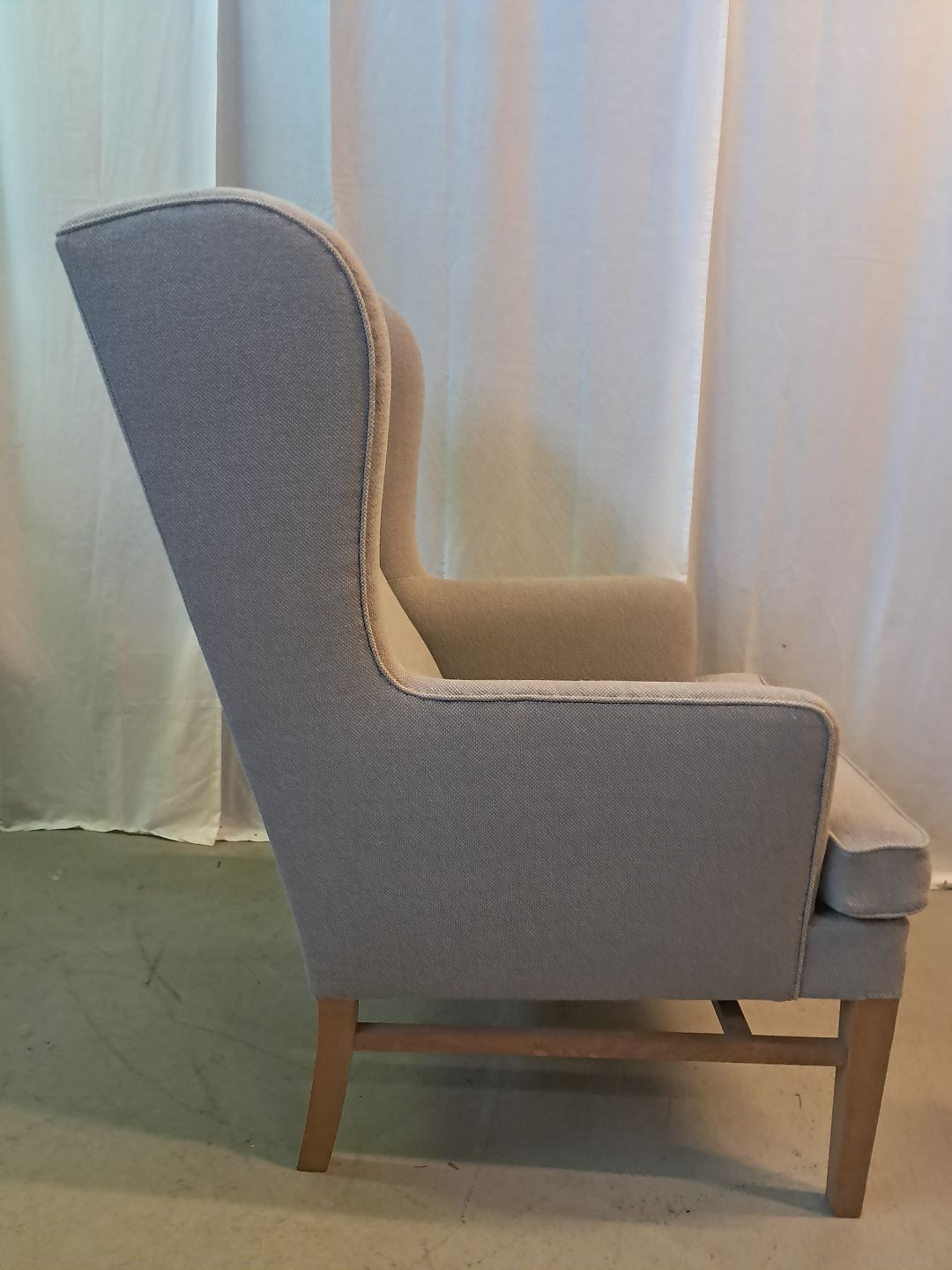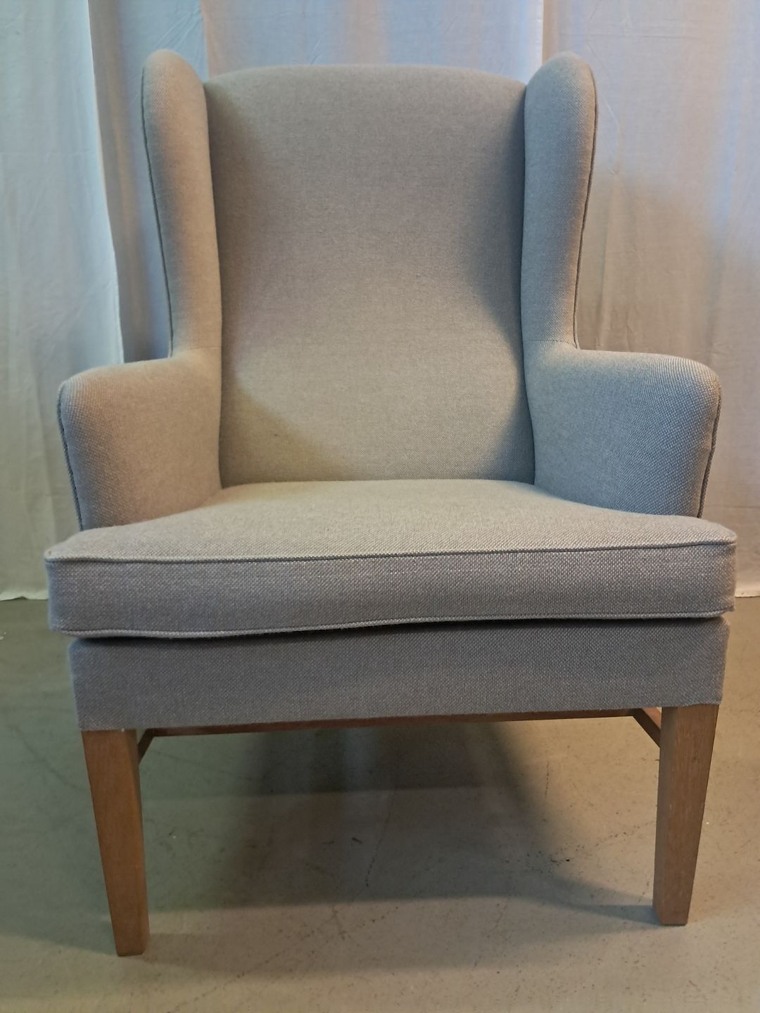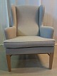 Lænestol med stofbetræk og ben i egetræ, fra 2000erne. Den har brugsspor. Ryghøjde 105cm Sædehøjde 46cm Emne nummer: 77459