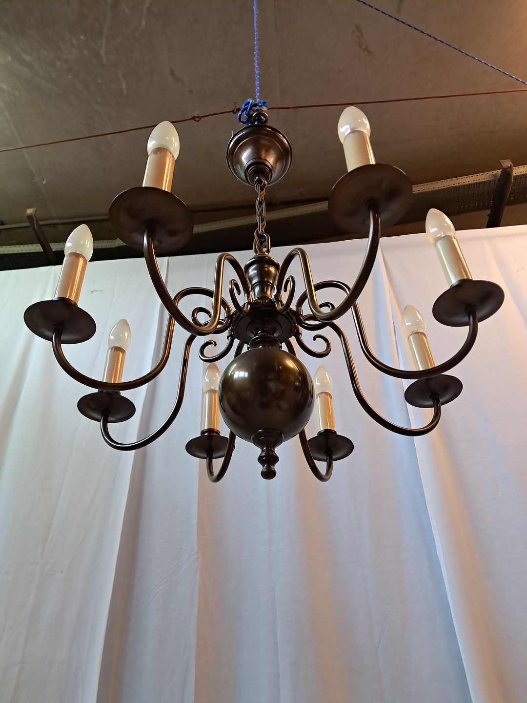 8-armet kirkekrone i bruneret messing, fra 1930erne. Den har brugsspor. Højde med kæde 65cm Diameter 61cm Emne nummer: 77473