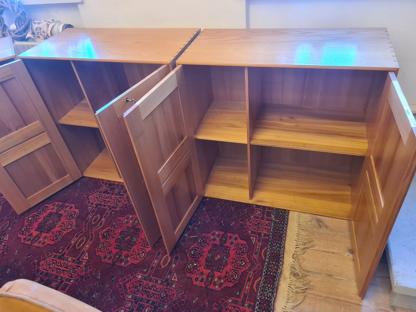 Mogens Koch skabe samt en halv reol udført i massiv Elm for Rud. Rasmussen. Fremstillet Ca. 1970’erne.