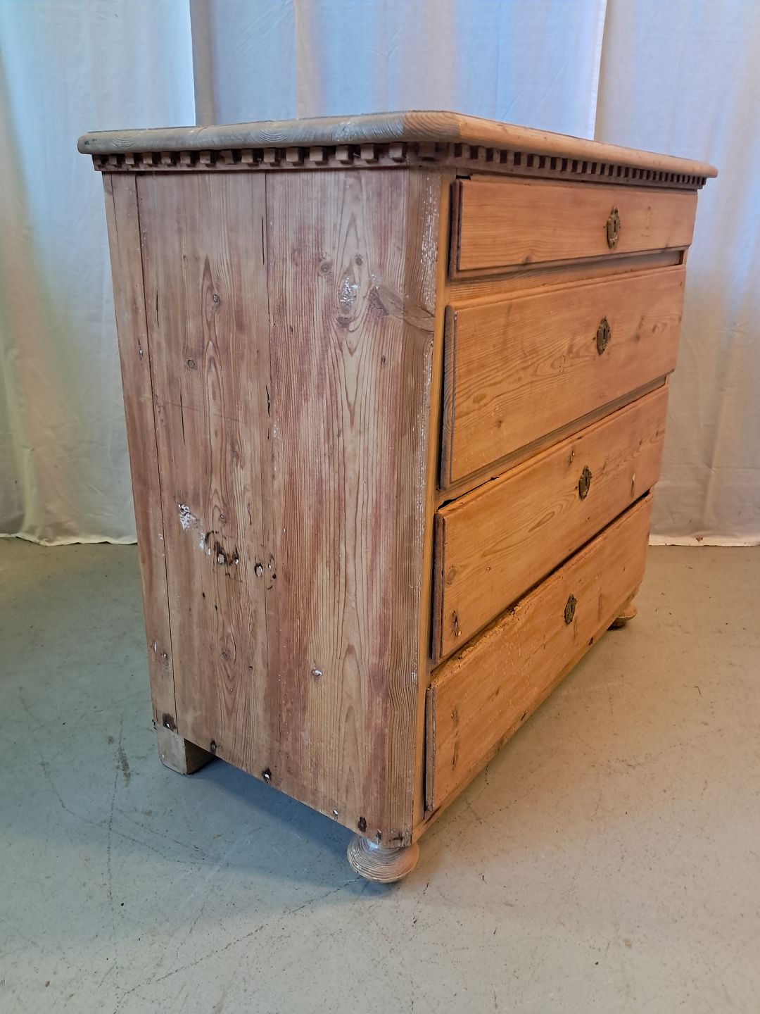 Kommode i massivt fyrretræ, fra 1910erne. Den har brugsspor og skufferne køre, men driller. Højde 91cm Bredde 99cm Dybde 50cm Emne nummer: 77505