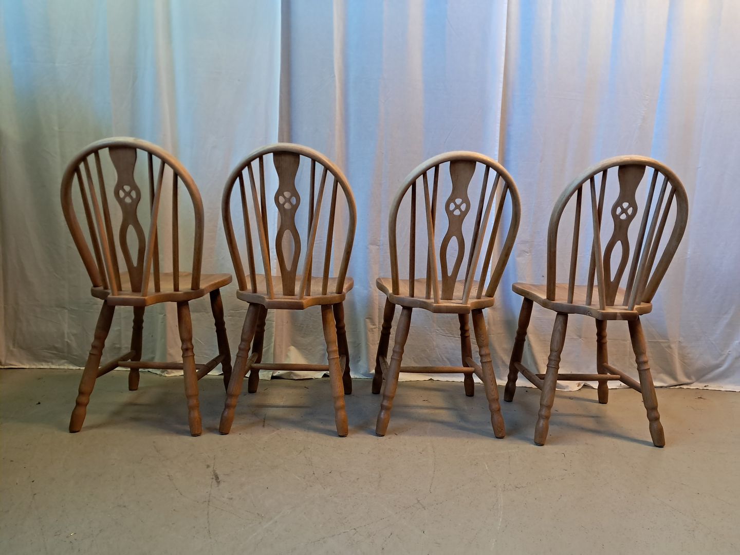4 Winsor stole i massivt egetræ, fra 1970erne. De har brugsspor. Ryghøjde 91cm Sædehøjde 45cm Emne nummer: 77516