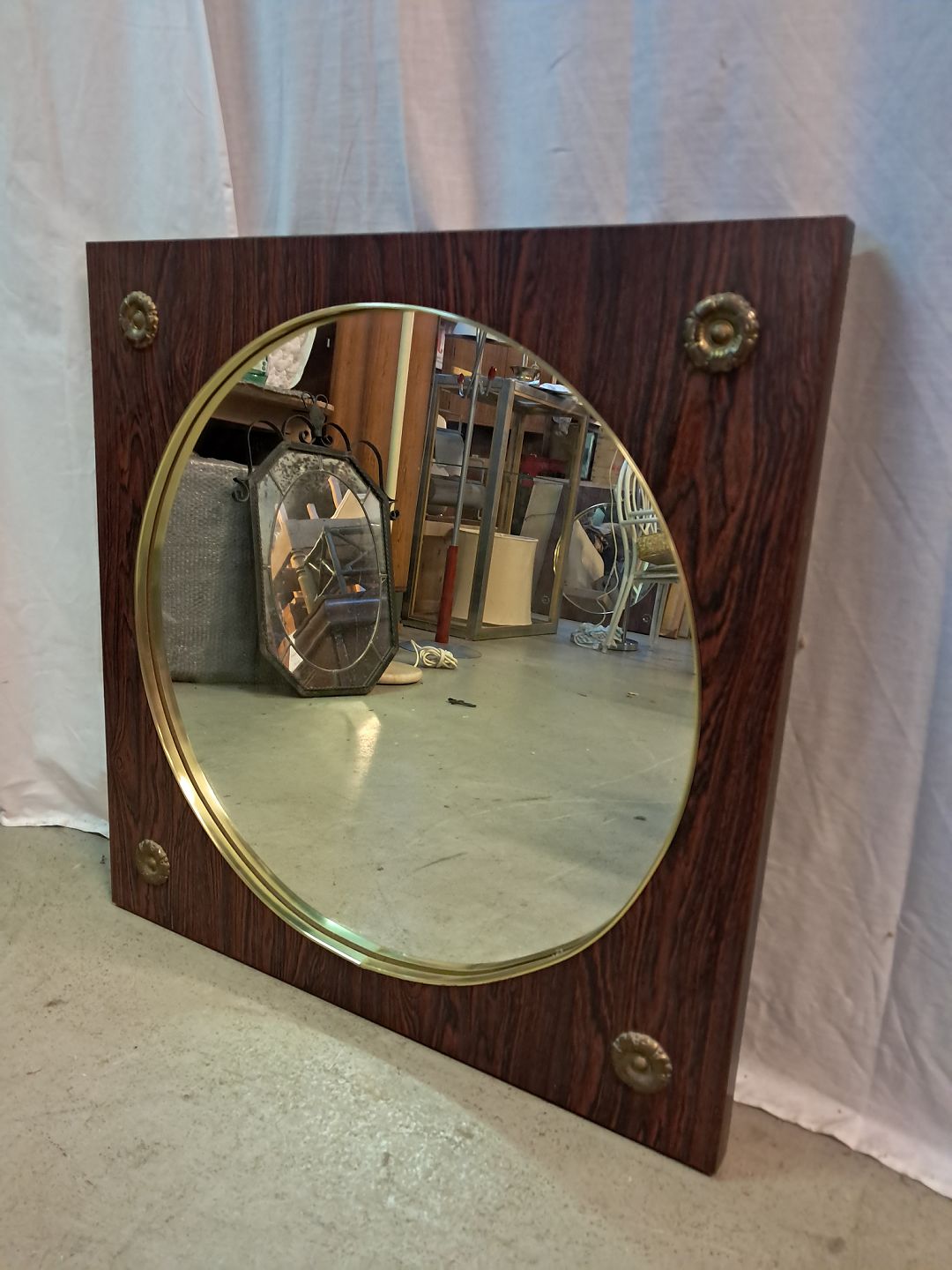 Spejl i fineret palisander, fra 1960erne. Det har brugsspor. Højde 75cm Bredde 75cm Emne nummer: 77593