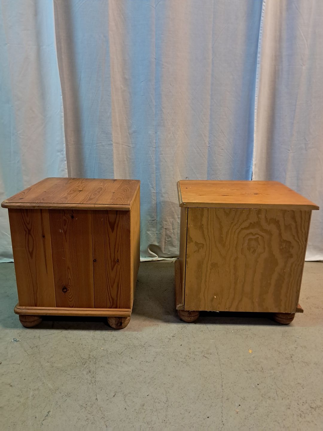 2 Små kommoder i massivt fyrretræ, fra 1980erne. De har brugsspor. Højde 45cm Bredde 44cm Dybde 40cm Emne nummer: 77603
