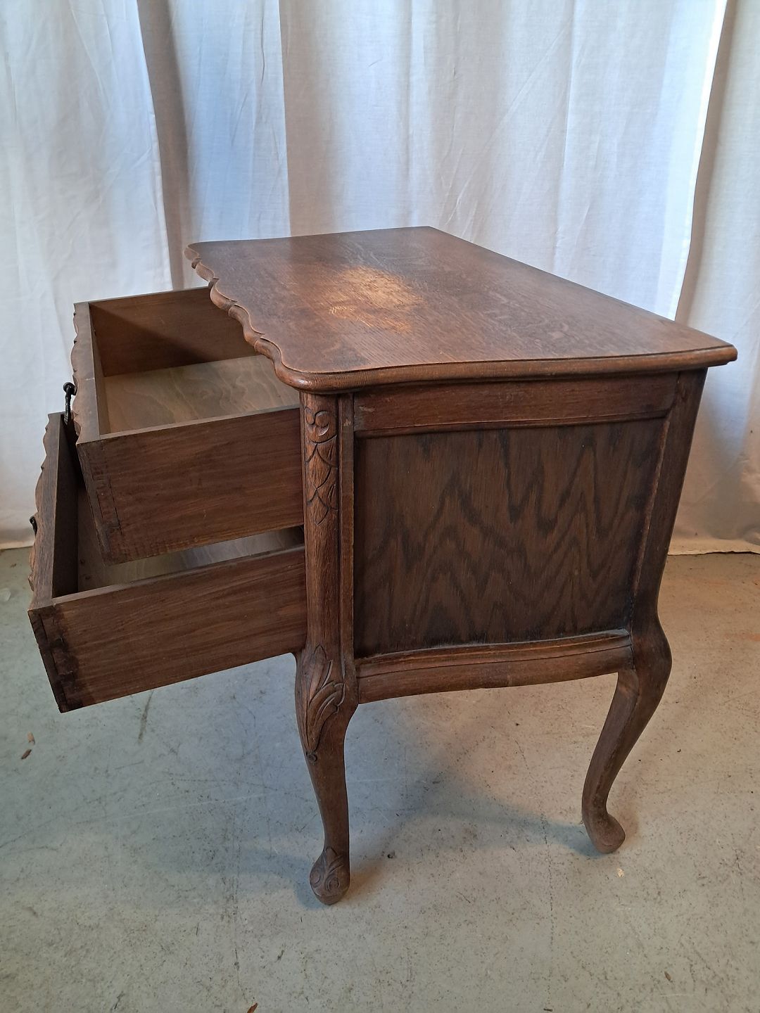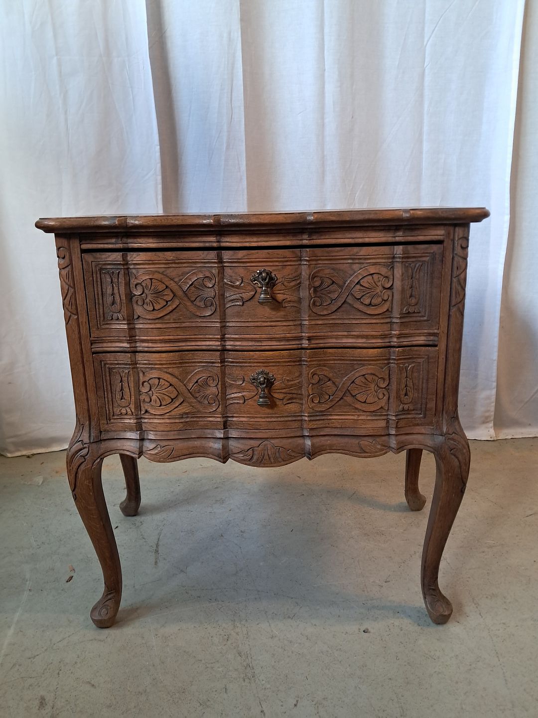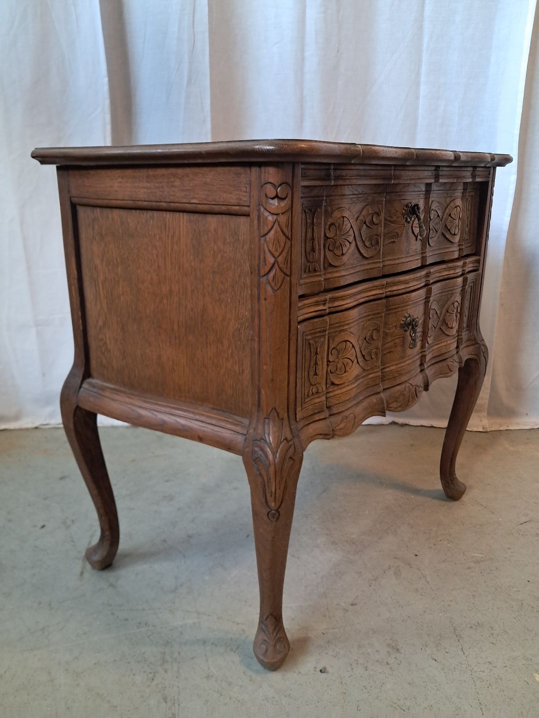 Kommode i fineret egetræ, fra 1950erne. Den har brugsspor. Højde 63cm Bredde 68cm Dybde 38cm Emne nummer: 77649