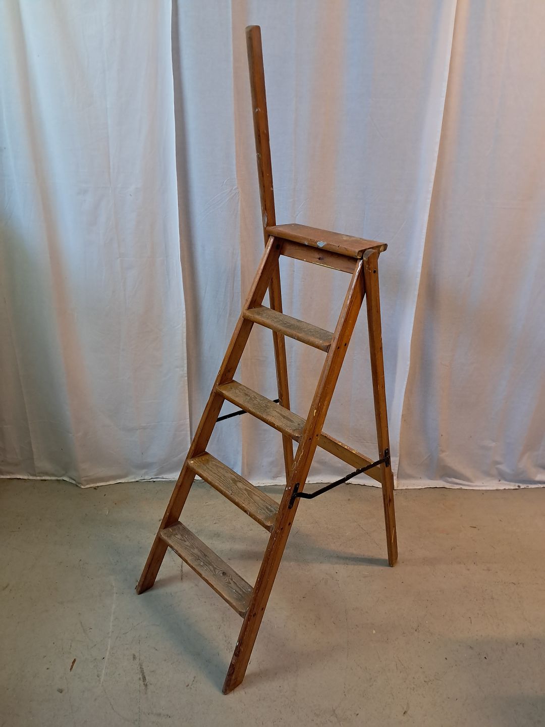Stige i massivt fyrretræ, fra 1940erne. Den har brugsspor. Højde 168cm Højde på øverste trin 119cm Emne nummer: 77653