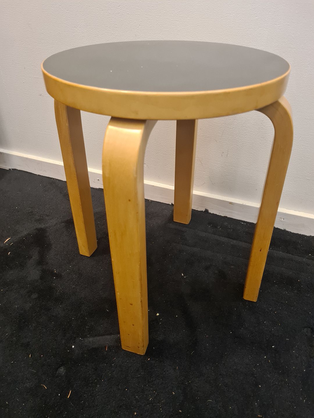 Taburet designet af Alvar Aalto. Her i bøg med sæde i sort formika. Fremstår pæn og velholdt uden de store brugsspor. Højde 44 cm. Diameter 34,5 cm. Emne nummer: 80915