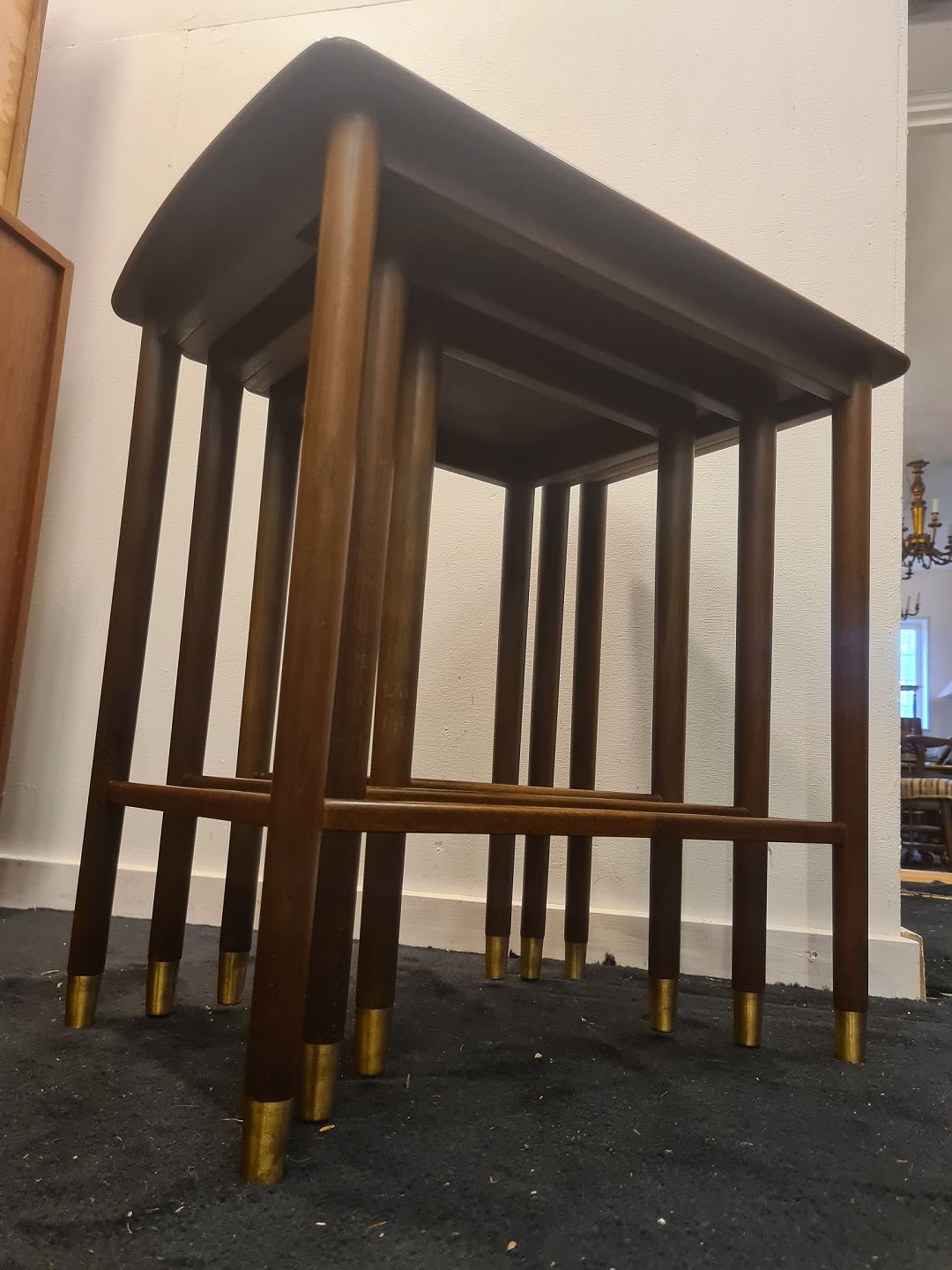Dansk Design indskudsborde fra 1970'erne i mahogni og med messing sko. Fremstår pæne og velholdte uden nævneværdige brugsspor. Højde 53 cm. Bredde 54,5 cm. Dybde 37 cm. Emne nummer: 80916