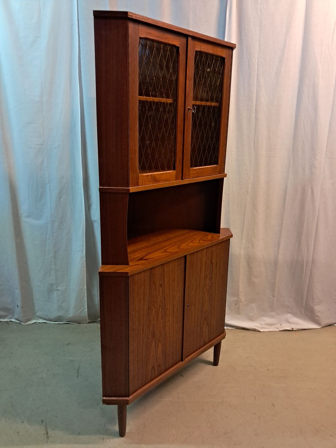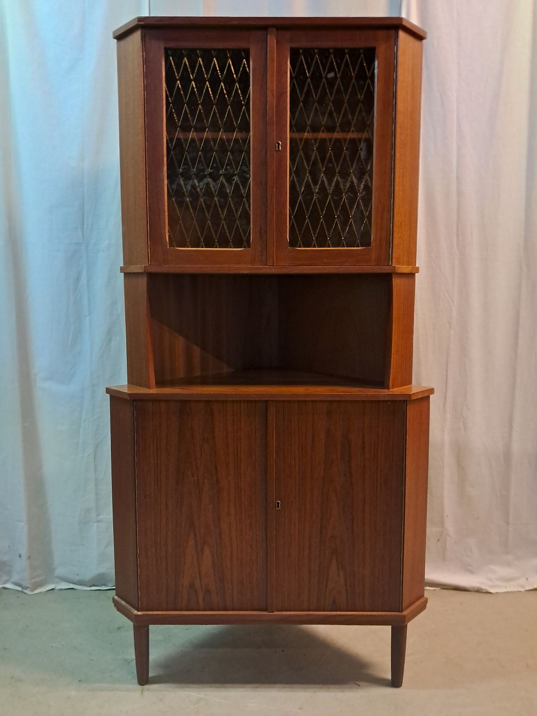 Hjørneskab i fineret teaktræ, fra 1960erne. Det har brugsspor. Højde 171cm Bredde 88cm Dybde 62cm Emne nummer: 77675