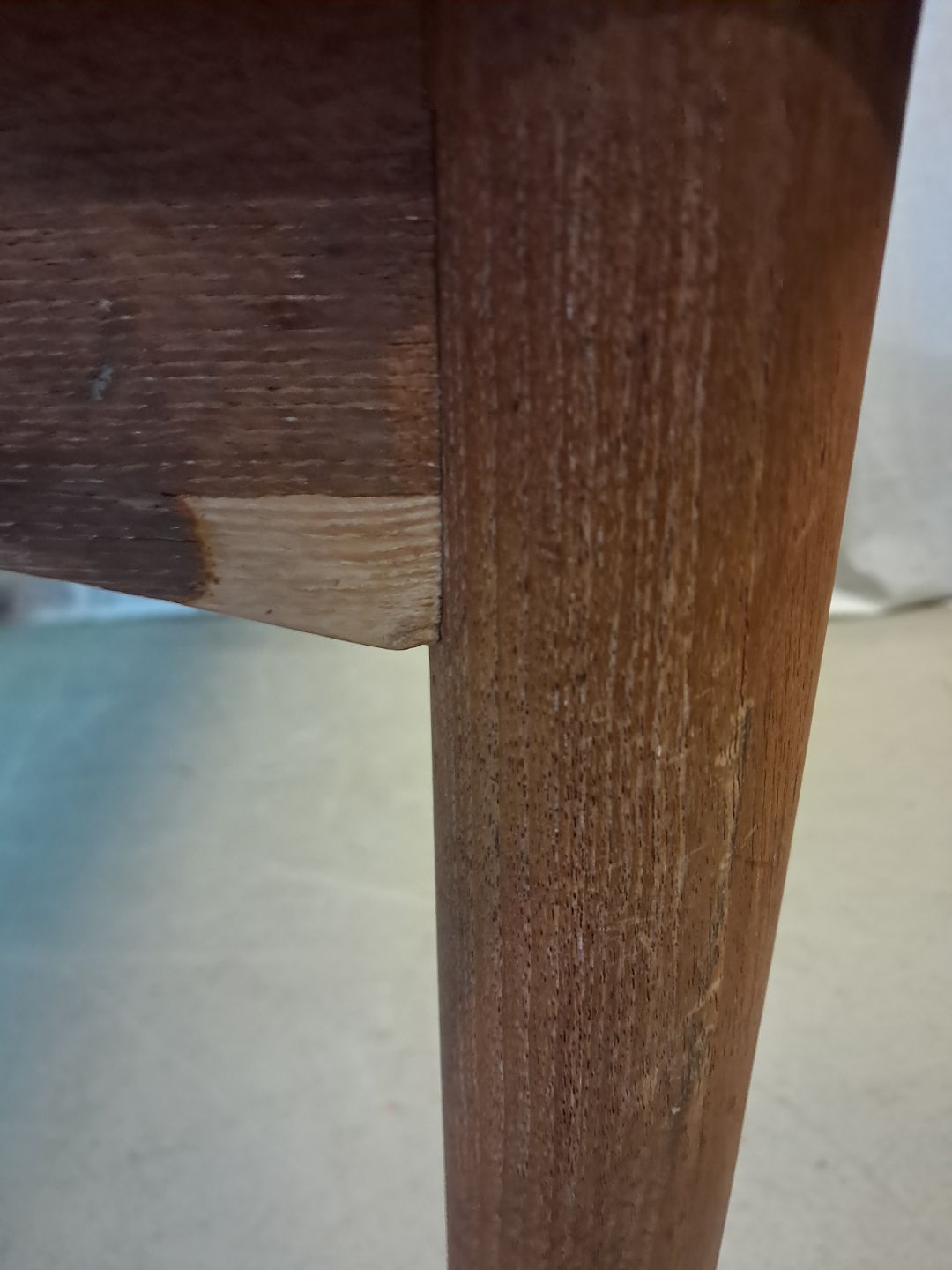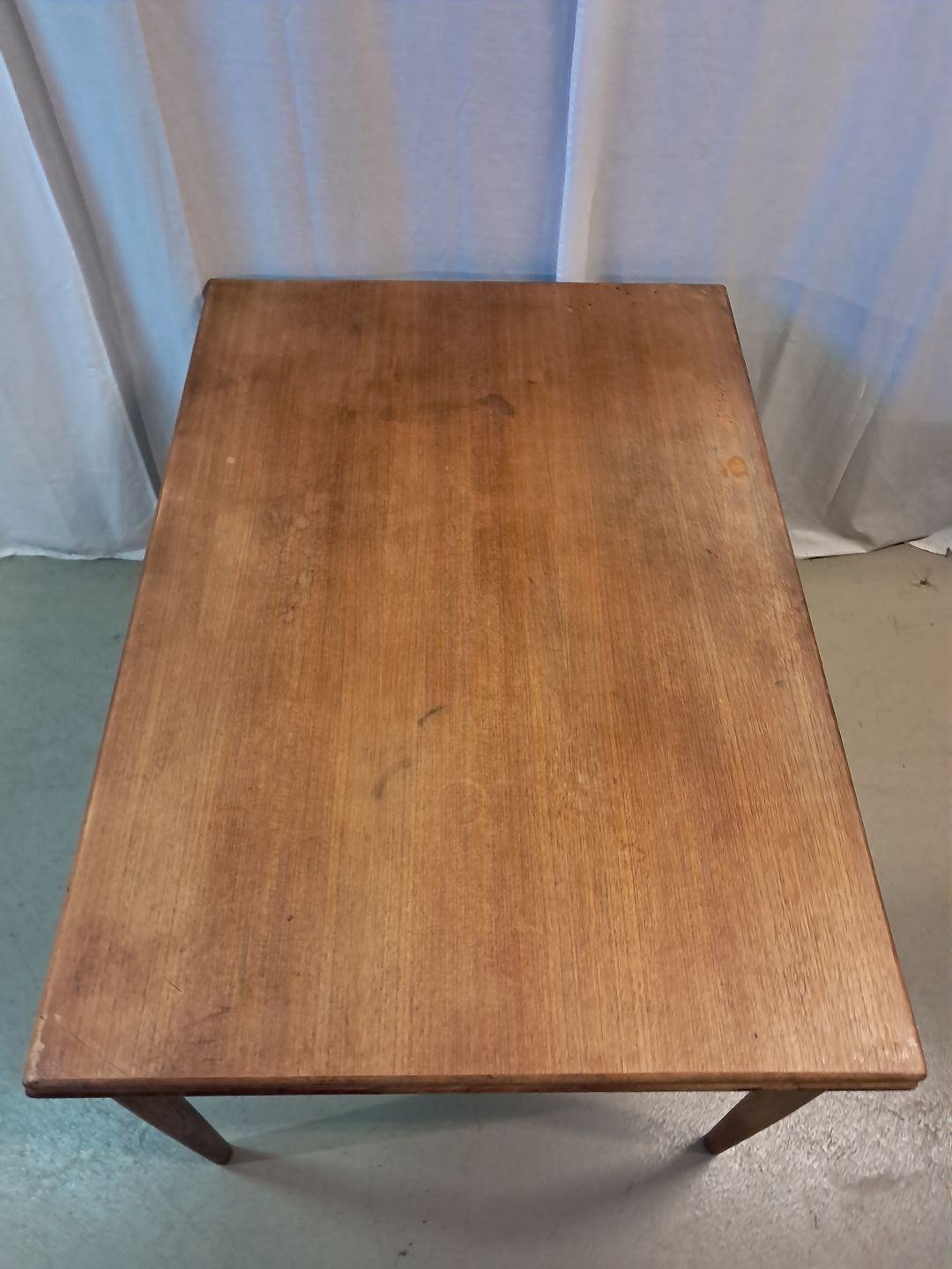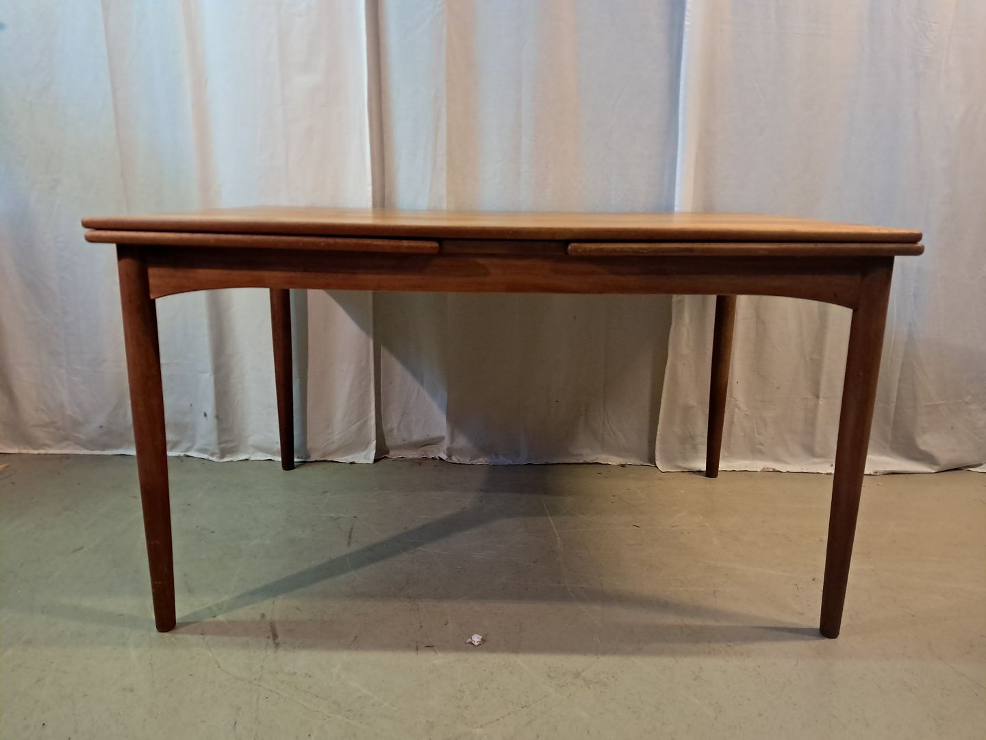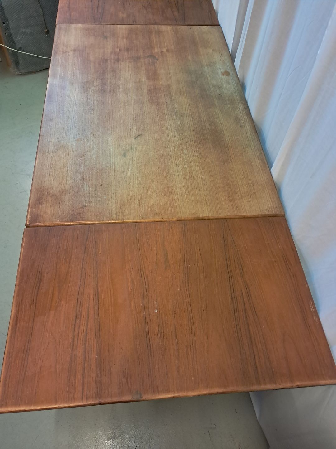 Spisebord i fineret teaktræ med hollandsk udtræk, fra 1960erne. Det har brugsspor og finer defekt. Højde 74cm Bredde 90cm Længde 130cm Længde med udtræk 240cm Emne nummer: 77677