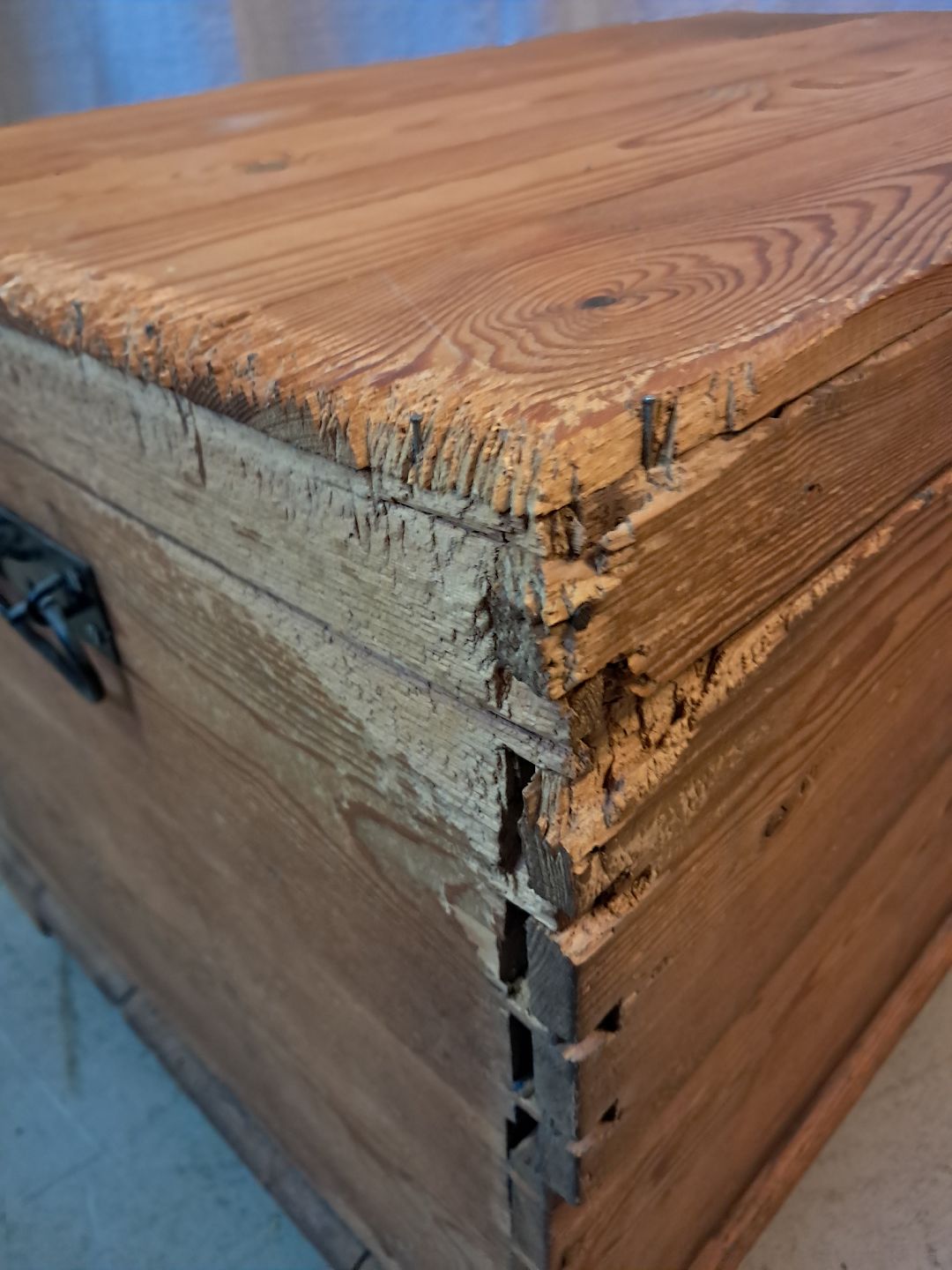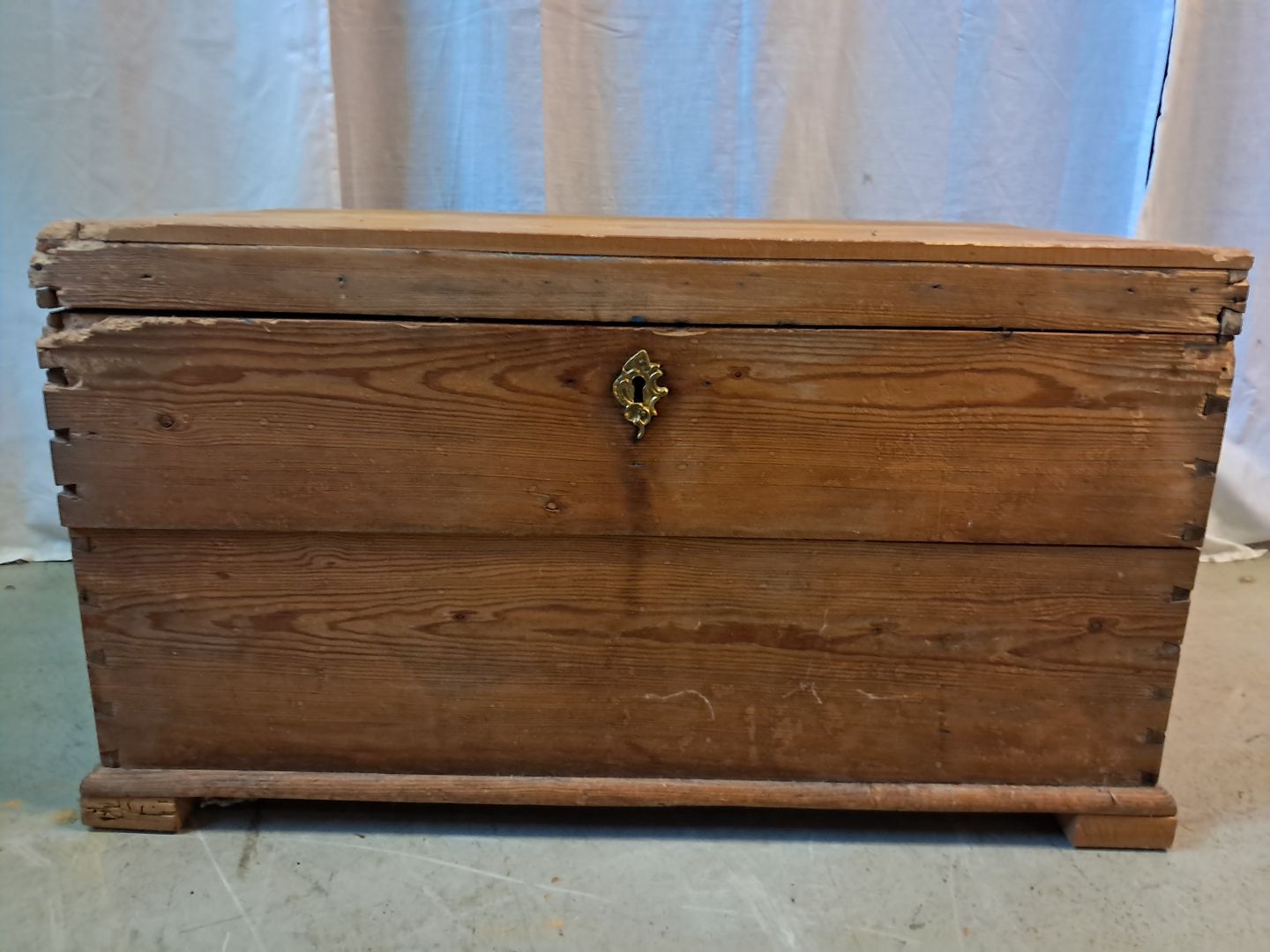 Kiste i massivt fyrretræ, fra 1910erne. Den har brugsspor og skal limes, der med følger ikke nøgle. Højde 39cm Bredde 71cm Dybde 42cm Emne nummer: 77691