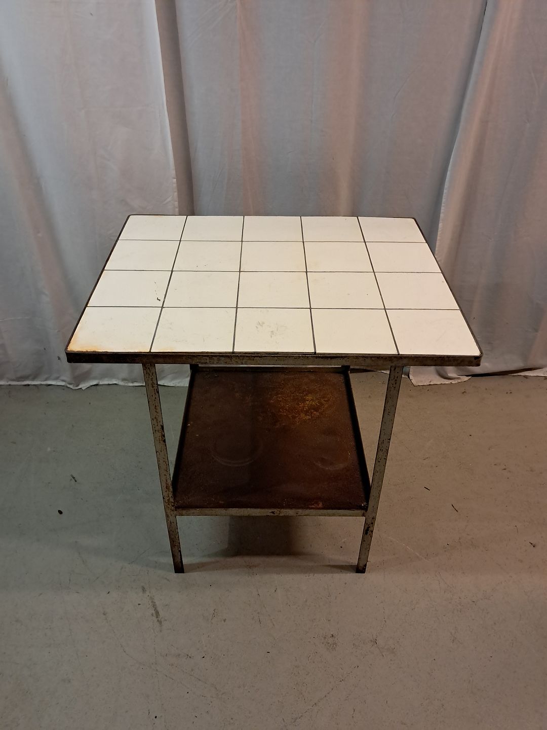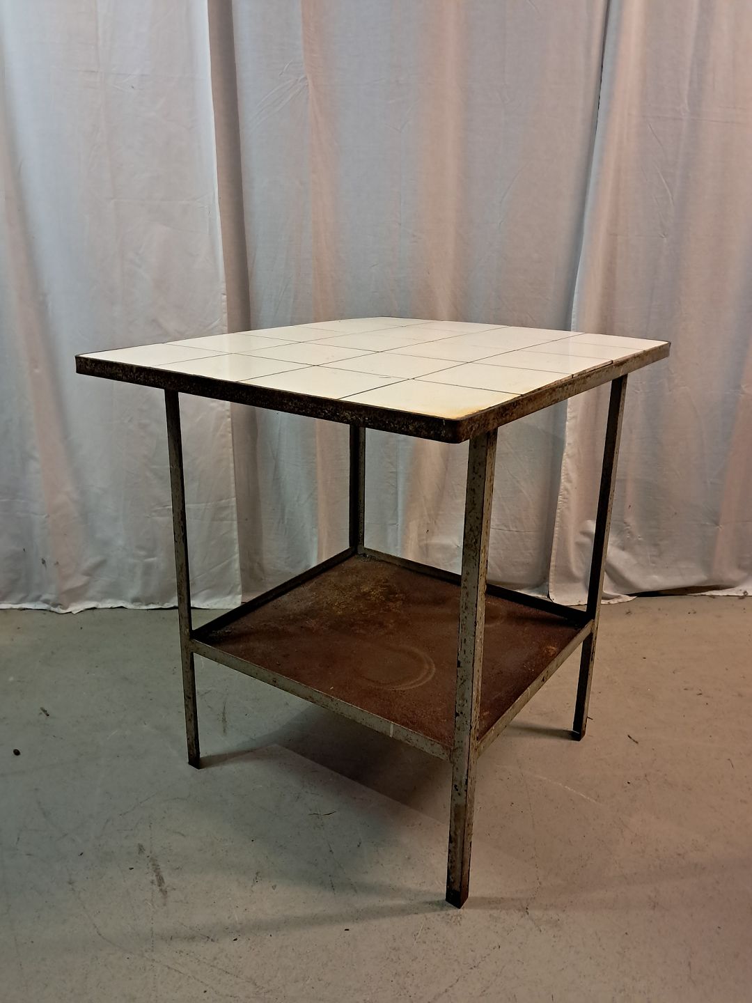 Gasbord i metal med fliser, fra 1930erne. Det har brugsspor. Højde 75cm Bredde 62cm Længde 78cm Emne nummer: 77705