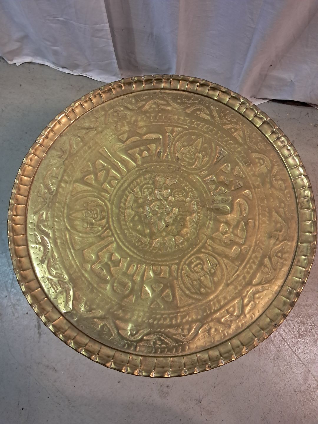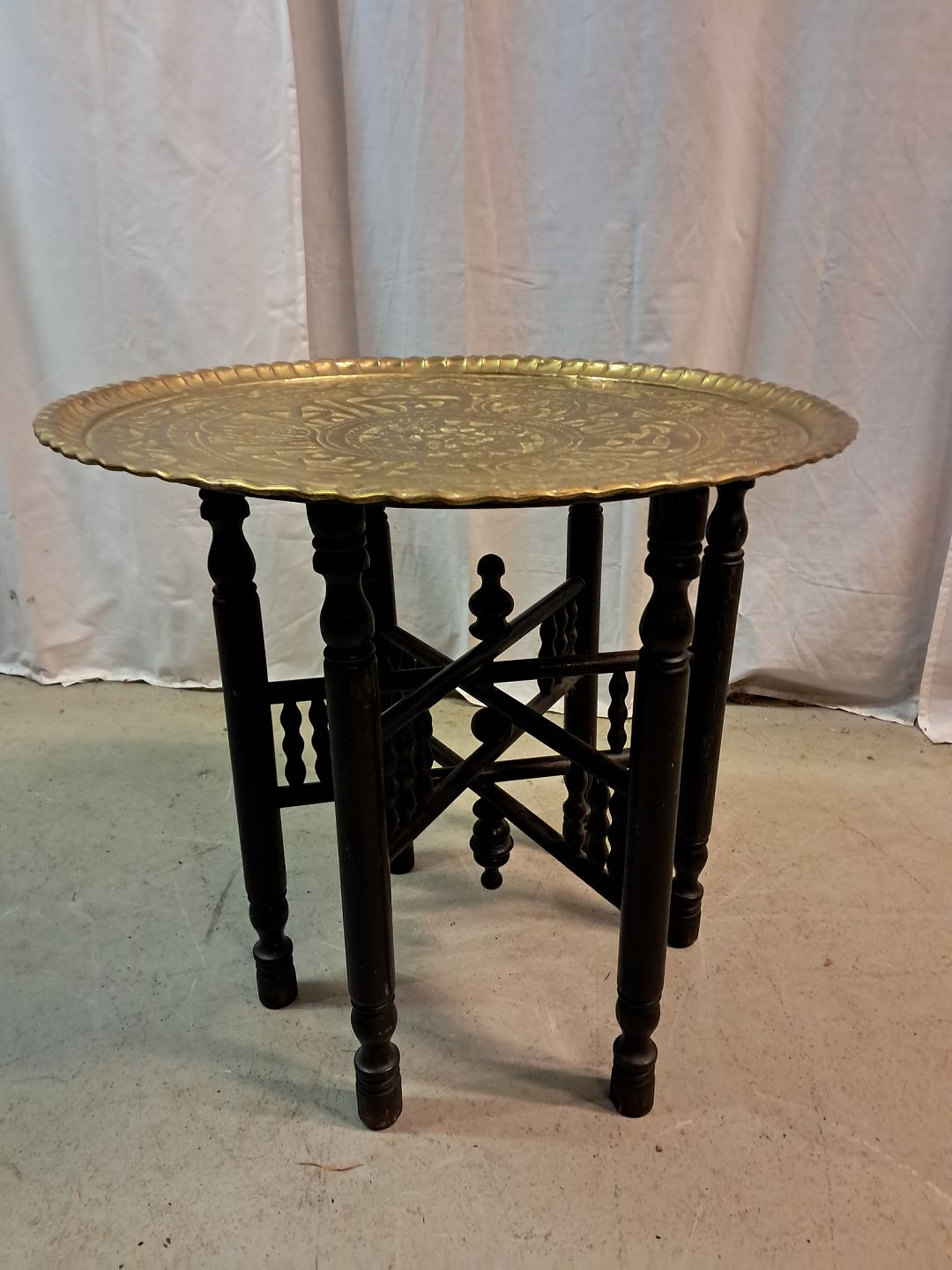 Pyntebord i massivt træ med messingplade, fra 1980erne. Det har brugsspor. Højde 52cm Diameter 55cm Emne nummer: 77706