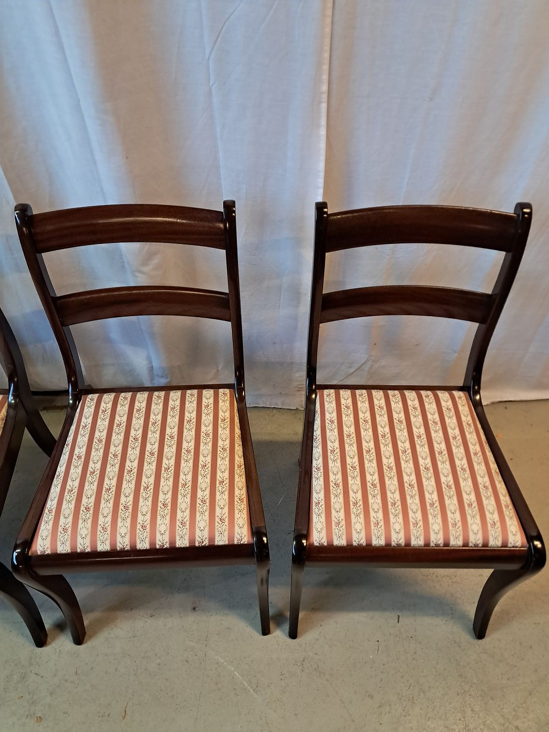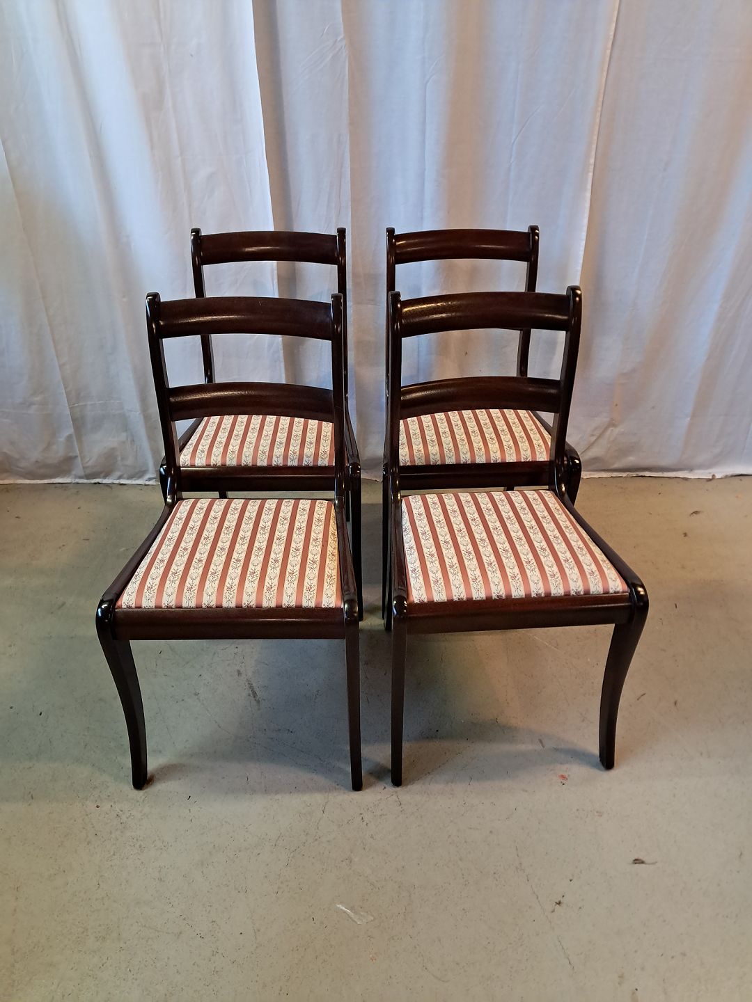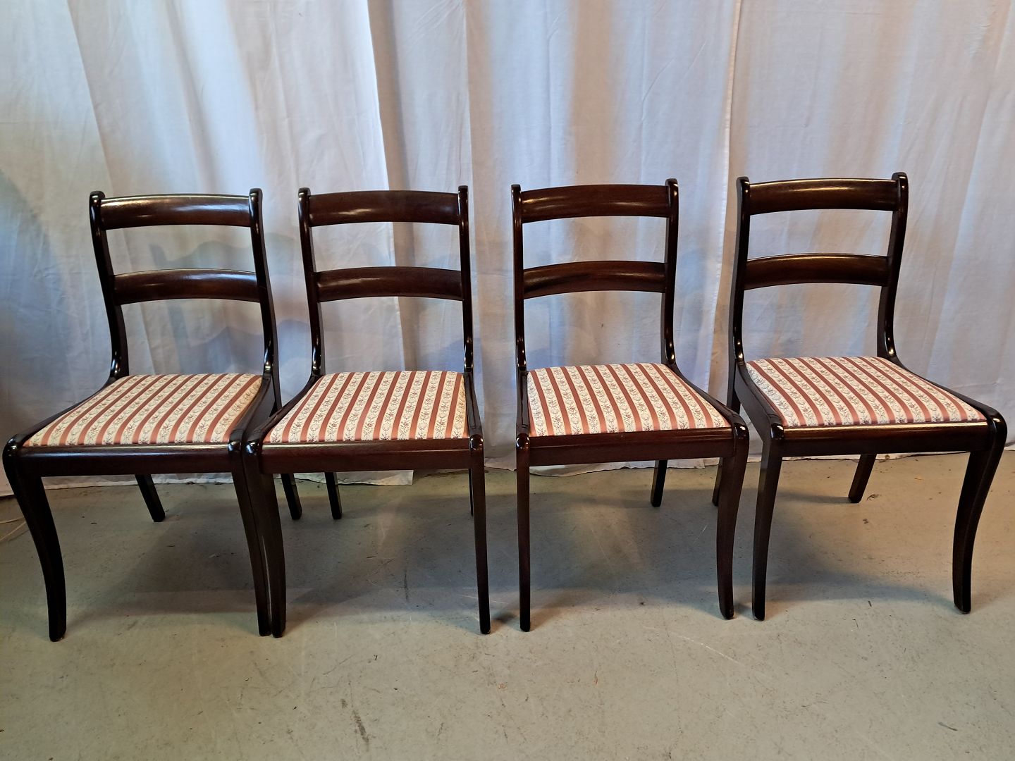 4 Stole i massivt mahogni og bøgetræ, fra 1980erne. De har brugsspor. Ryghøjde 84cm Sædehøjde 44cm Emne nummer: 77715