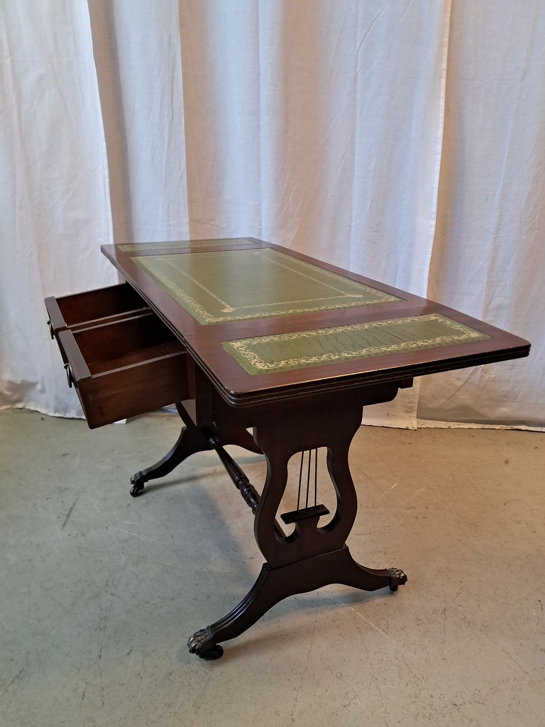 Sofabord i fineret mahogni med læderindlæg, fra 1980erne. Det har brugsspor. Højde 56cm Bredde 39cm Længde 60cm Længde med klapper 96cm Emne nummer: 77716