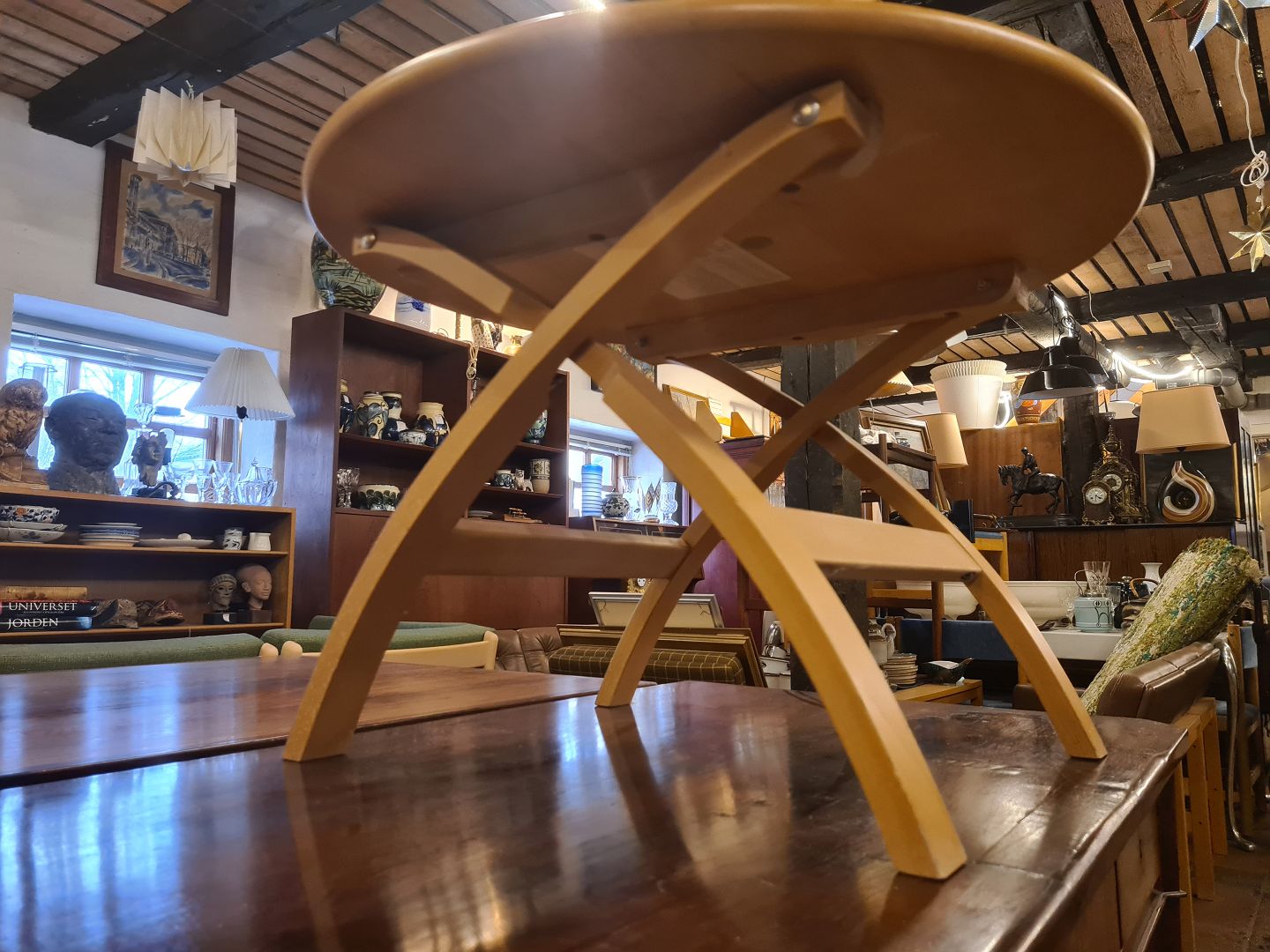 Haslev Møbelsnedkeri sofa/lampebord i massiv bøg. Fremstillet 1990'erne. Brugtstand, plade med større skjolder. Mål: H. 43 cm. Ø. 54 cm. Emne nummer: 80927