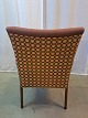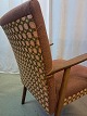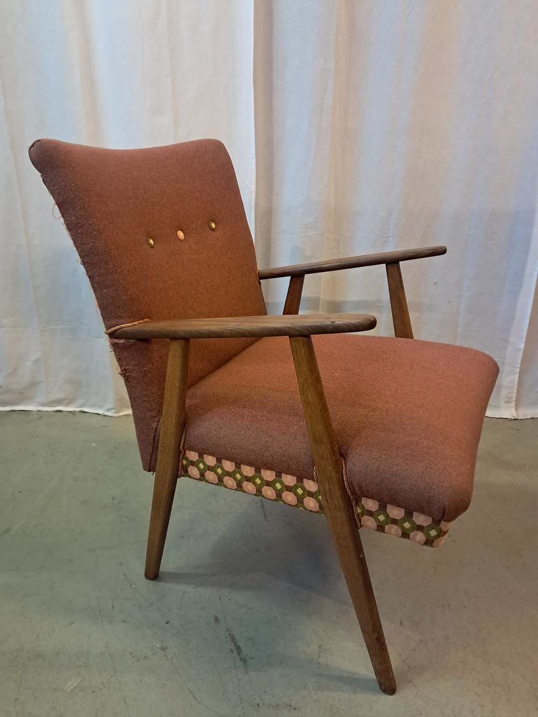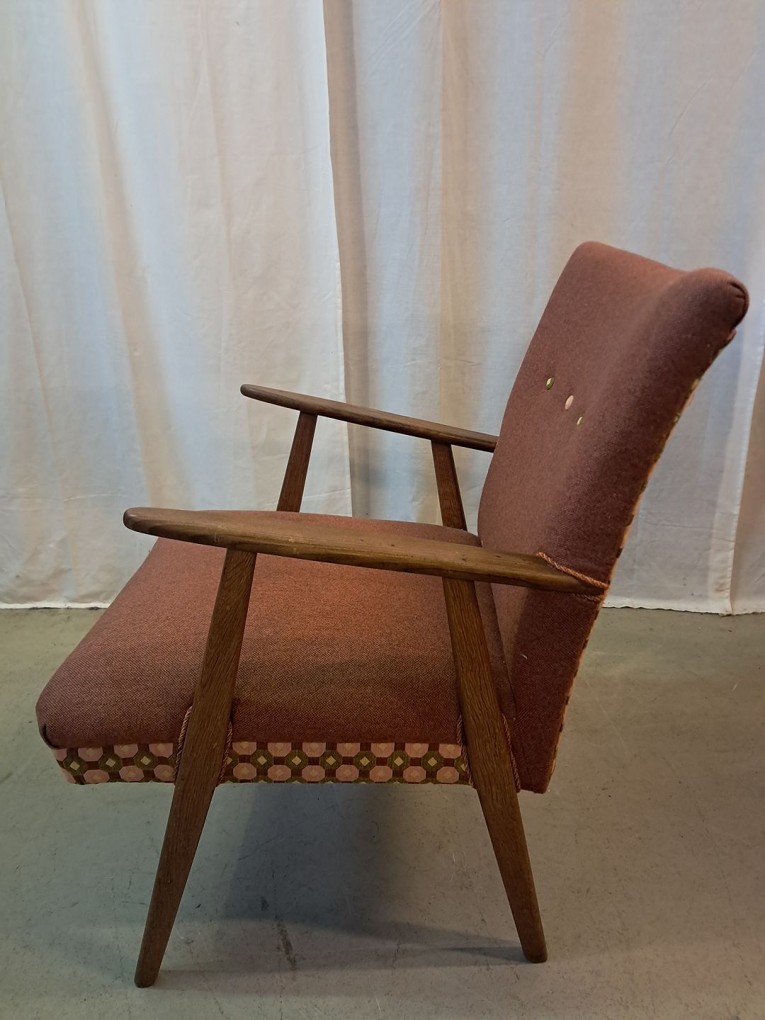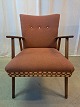 Lænestol i teaktræ med stofbetræk, fra 1960erne. Den har brugsspor og der er slid på den ene side. Ryghøjde 80cm Sædehøjde 42cm Emne nummer: 77735