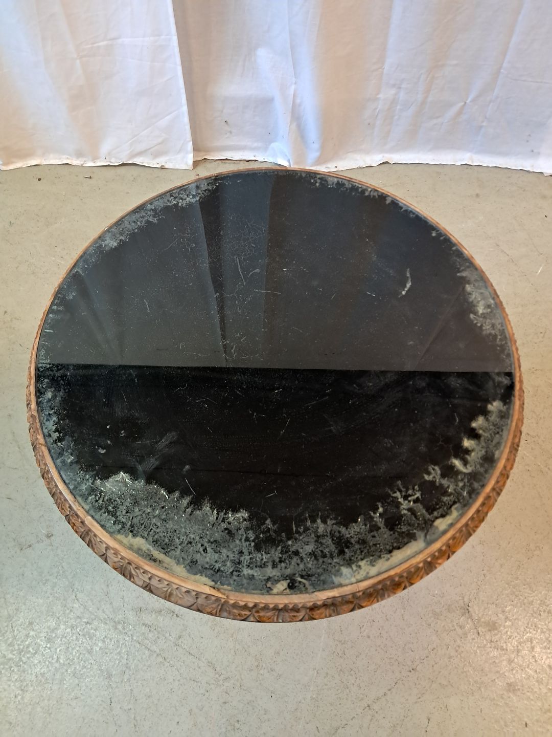 Lampebord i birketræ med glasplade, fra 1930erne. Det har defekter. Højde 52cm Diameter 46cm Emne nummer: 77739