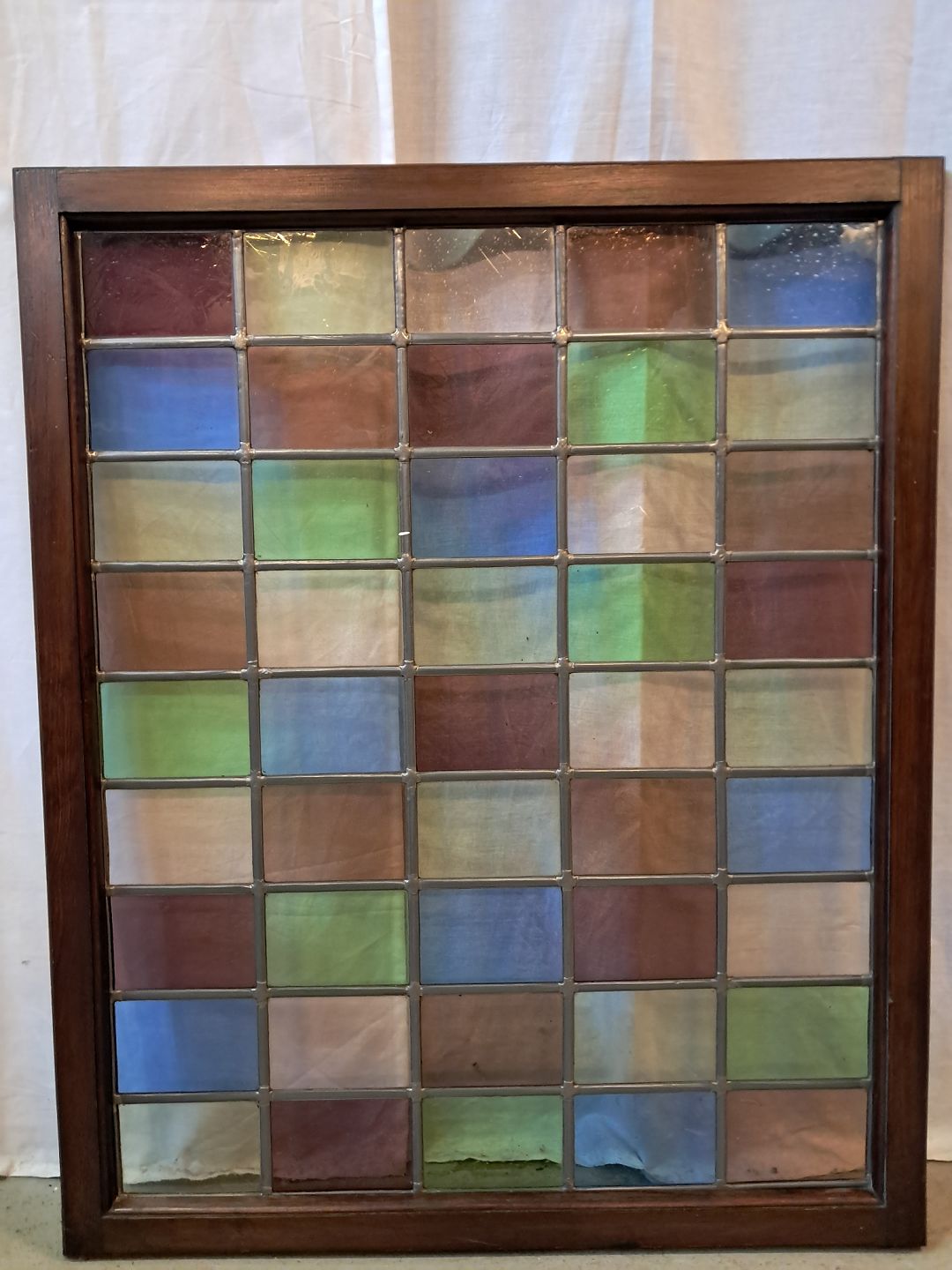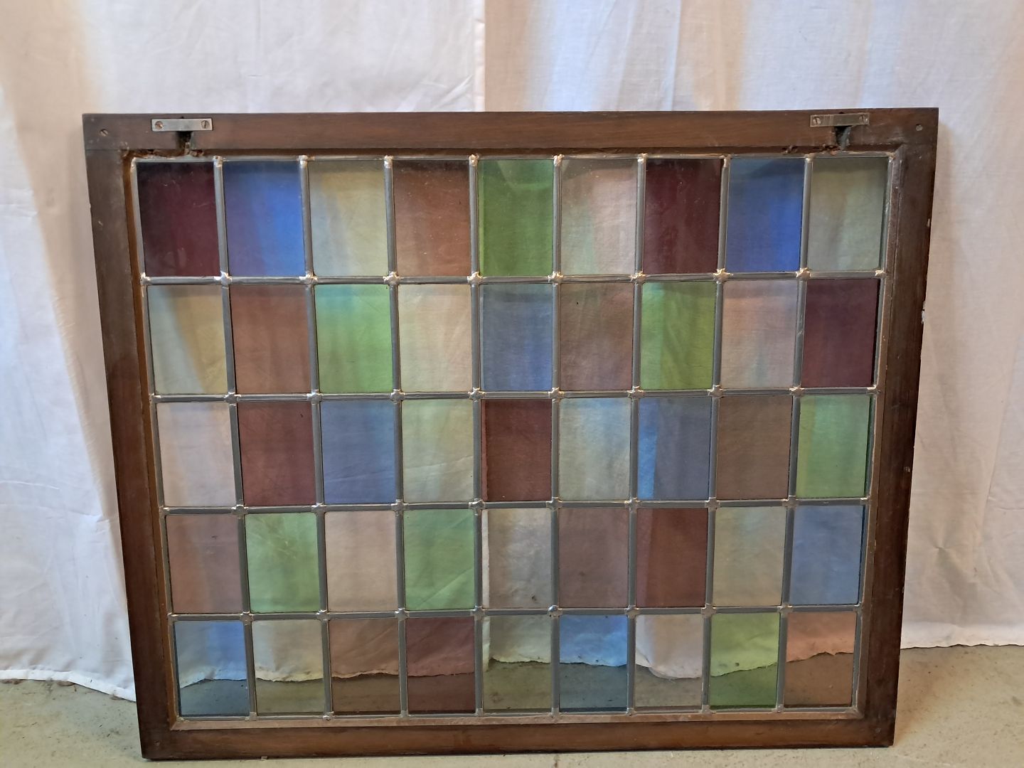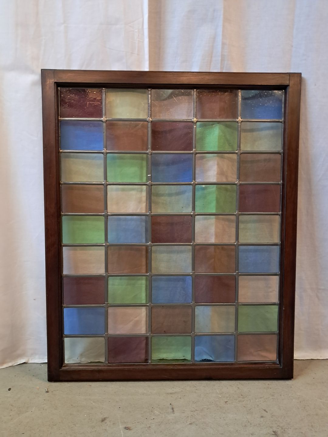 Blyindfattet rude med ramme i massivt fyrretræ, fra 1970erne. Højde 88cm Bredde 72cm Emne nummer: 77743