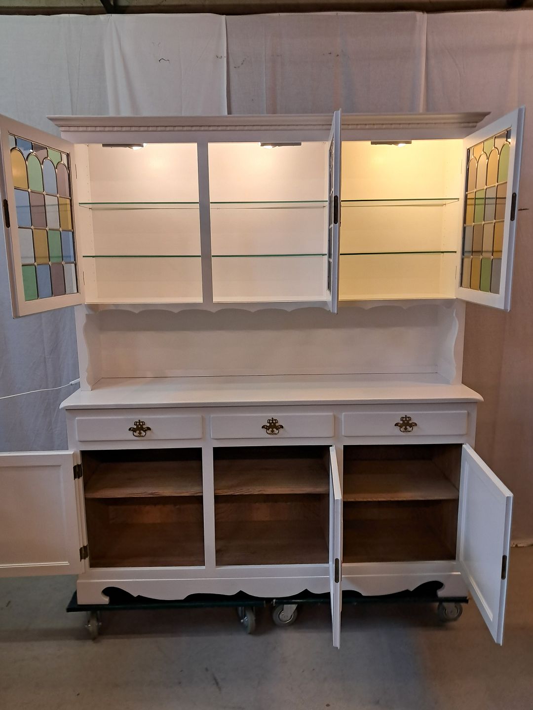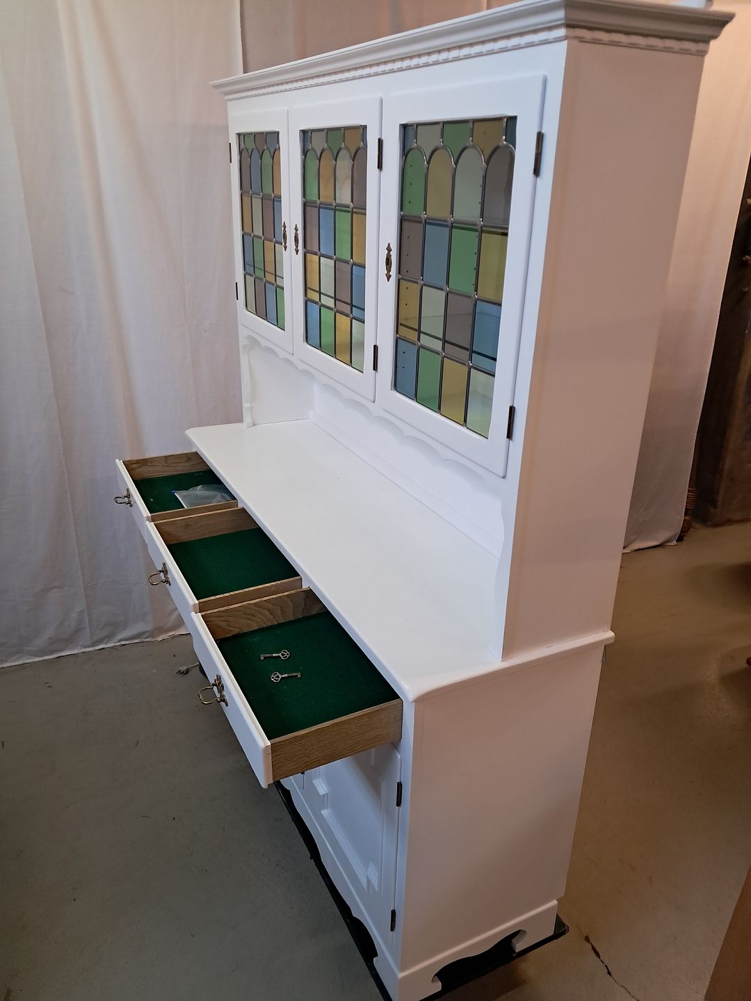 Malet skab med vitrineoverdel, fra 1980erne. Det har brugsspor. Højde 180cm Bredde 153cm Dybder 44cm og 25cm Emne nummer: 777444