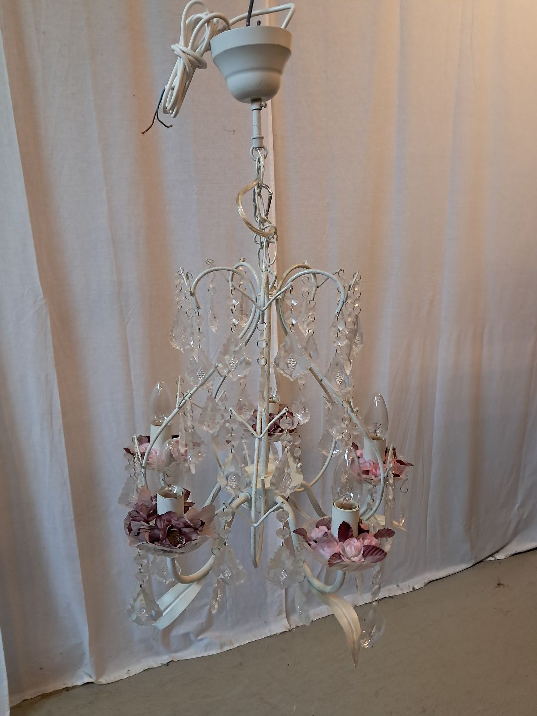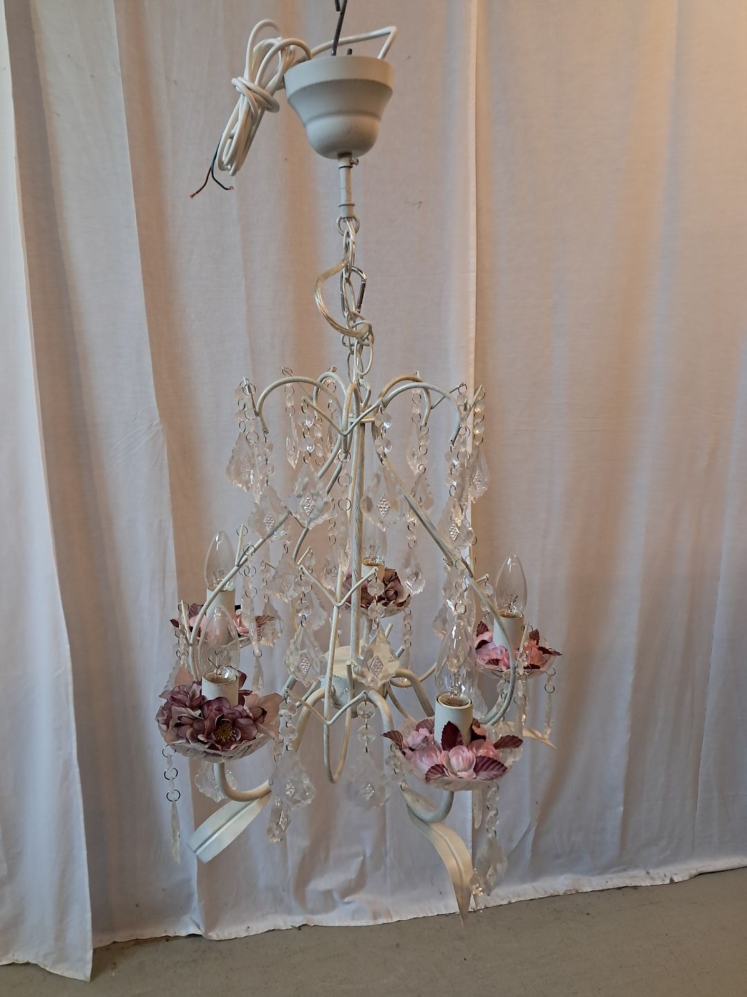 Malet lysekrone i metal med plastprismer, fra 1990erne. Den har brugsspor. Højde 70cm Diameter 42cm Emne nummer: 77747