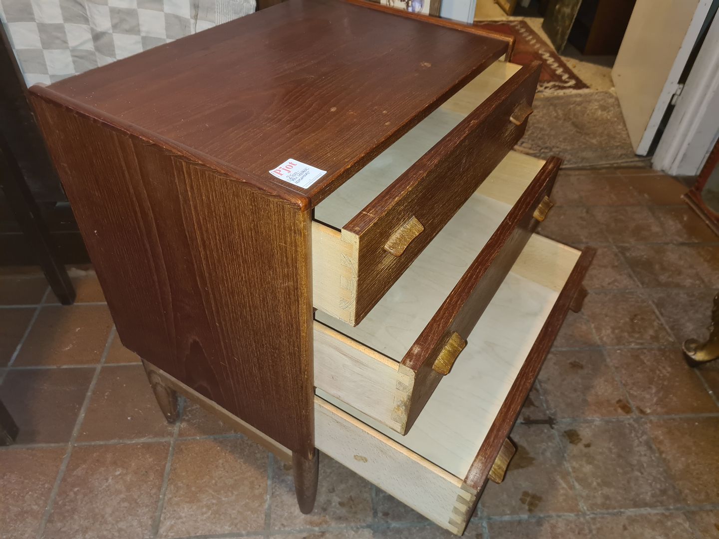 Poul Volther kommode udført i fineret teak m. stel i eg. Produceret ca. 1960'erne. Fremstår med brugsspor, herunder ridser og mærker. Mål: H. 73 cm. B. 60 cm. D. 42 cm. Emne nummer: 81005