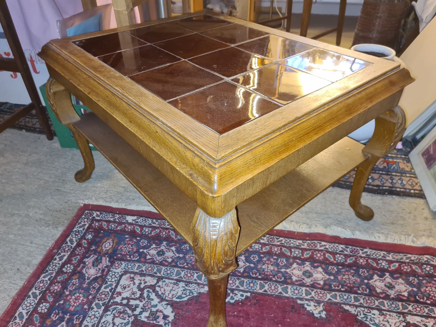 Dansk møbelproducent sofabord i eg m. kakler. Udført ca. 1930'erne. Fremstår i pæn brugt stand. Mål: H. 49 cm. L. 76 cm. B. 61 cm. Emne nummer: 81026