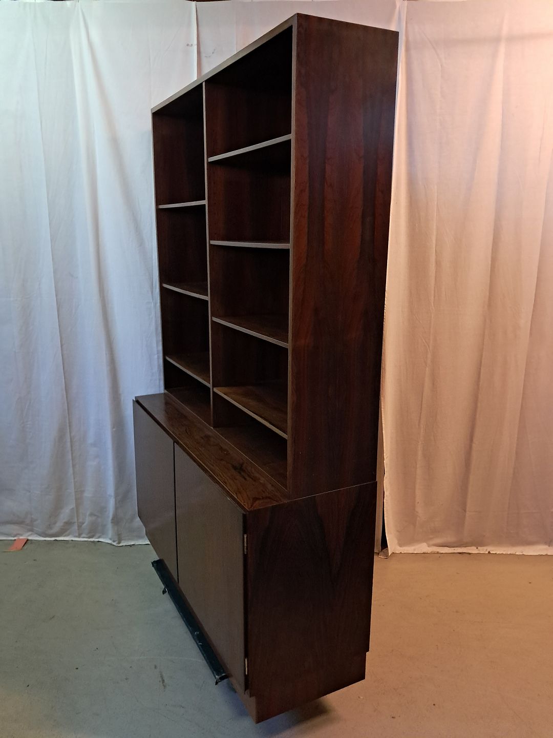 2 Delt reol i fineret palisander, fra 1960erne. Den har brugsspor og et lille hak i lågen. Højde 187cm Bredde 120cm Dybder 43cm og 29cm Emne nummer: 77758