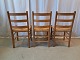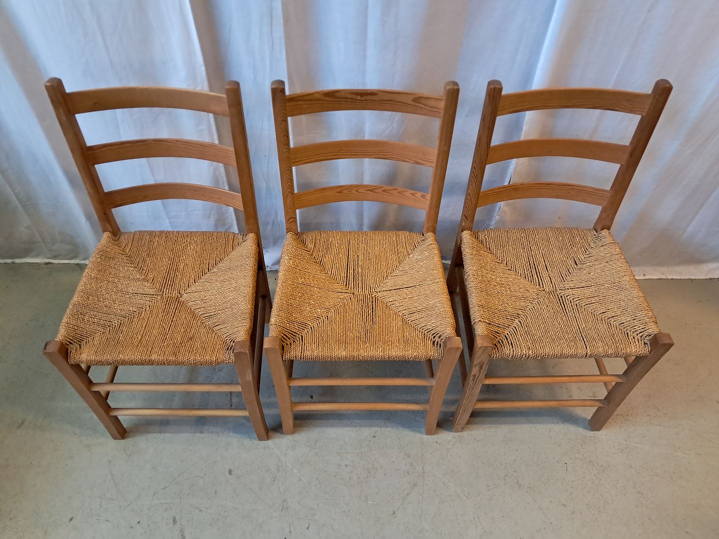 3 Stole i massivt fyrretræ, fra 1980erne. De har brugsspor. Ryghøjde 86cm Sædehøjde 43cm Emne nummer: 77772