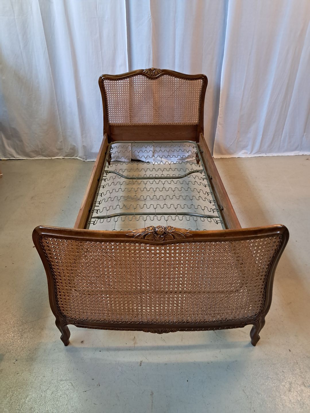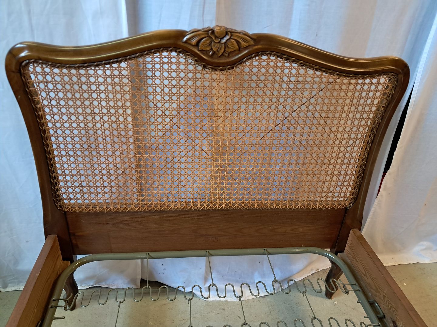 Seng i nødetræ med rørflet, fra 1950erne. Den har brugsspor og der medfølger ikke madras. Gavlhøjder 87cm og 69cm Bredde 93cm Længde 195cm Madras mål : 85cm X 190cm Emne nummer: 77773